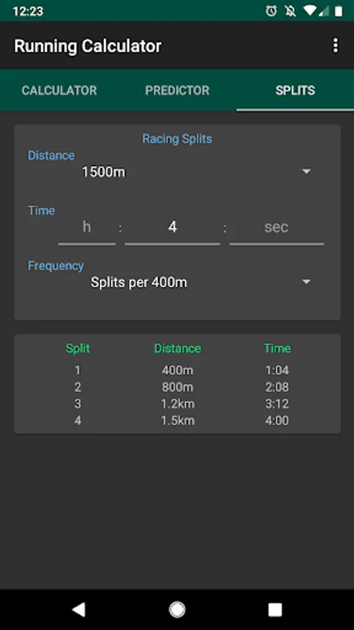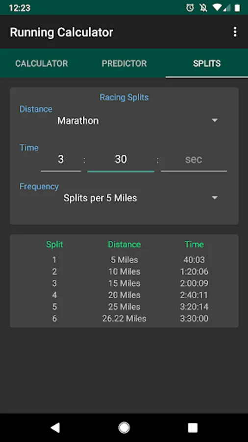 Finally you can use Running Calculator to plan your race strategy using the running splits screen. Pick a distance from 800m, 1500m, 5k, 10k, half marathon, marathon or a custom distance in miles or kilometres, enter your finish time and we'll display the splits that you will need to run for that time. You can configure whether you would like the splits listed per kilometre, per mile, per 400m, per 5 kilometres or per 5 miles. Why not try it out at your next parkrun or race and see how you get on?