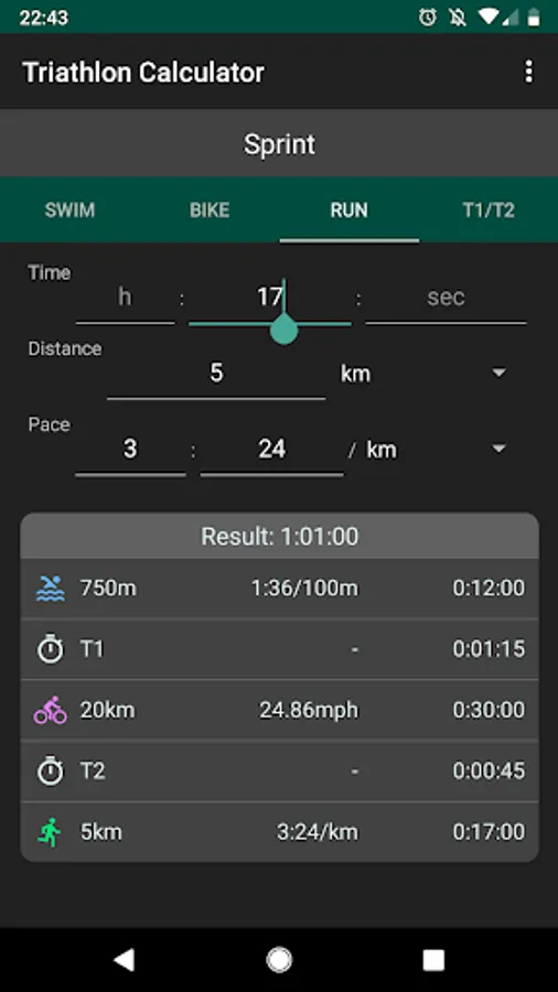 The run section of triathlon calculator lets you enter your pace, distance and time. Pace can be selected per kilometer, mile or per 400m. Distance can be entered in kilometers or miles.