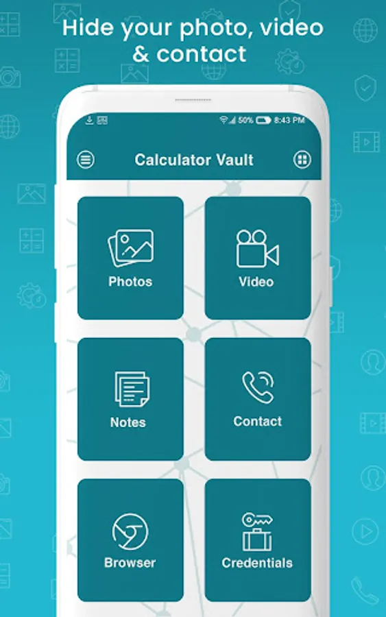 Calculator gallery vault is a private photo lock app and photo hider app that lets you hide pictures and personal picture lock and photo hider albums or secret videos behind calculator hide the app. Lock the app with a password or pattern lock to protect your privacy. You can only open private photo vault by typing a correct password into our smart calculator photo hider. The smart calculator supports fake password to show fake content in extreme cases when you need to open a secret locker in front of other peoples. This is enabling intruder selfie lets you capture intruder's photo and show them when you entering into smart vault calculator locker. Hide your personal audio, contacts apks and any documents easily vault application. You can directly hide pictures and videos from phone gallery or sd card by sharing to gallery lock app download.