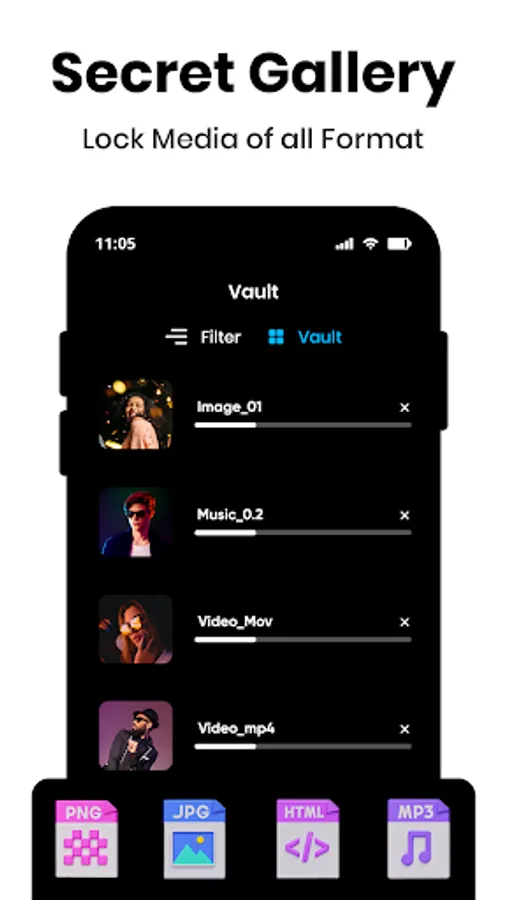 ⩺ Photo Vault can hide pictures and videos or other documents. Hidden private photo and videos are hidden from Gallery and only visible in the private photo vault and video vault calculator Lock.