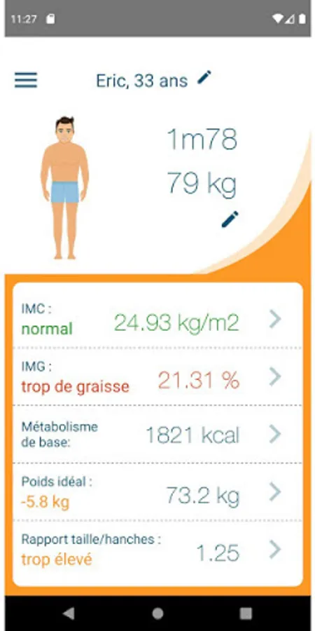 Our free application allows you to know your ideal weight, your BMI, your IMG, your ideal measurements as well as your basic metabolism in a few clicks. You just have to enter some basic information like height and weight and you will see the results right away. This app is ideal for tracking your weight changes in just a few clicks!