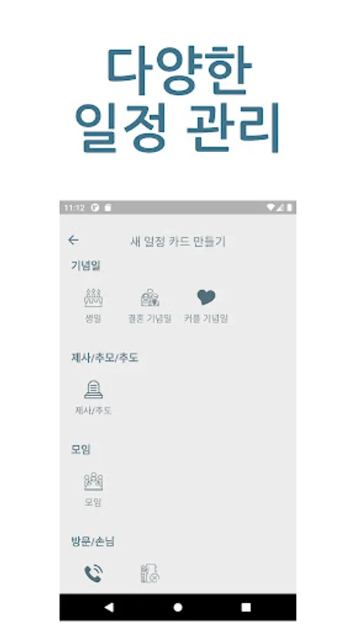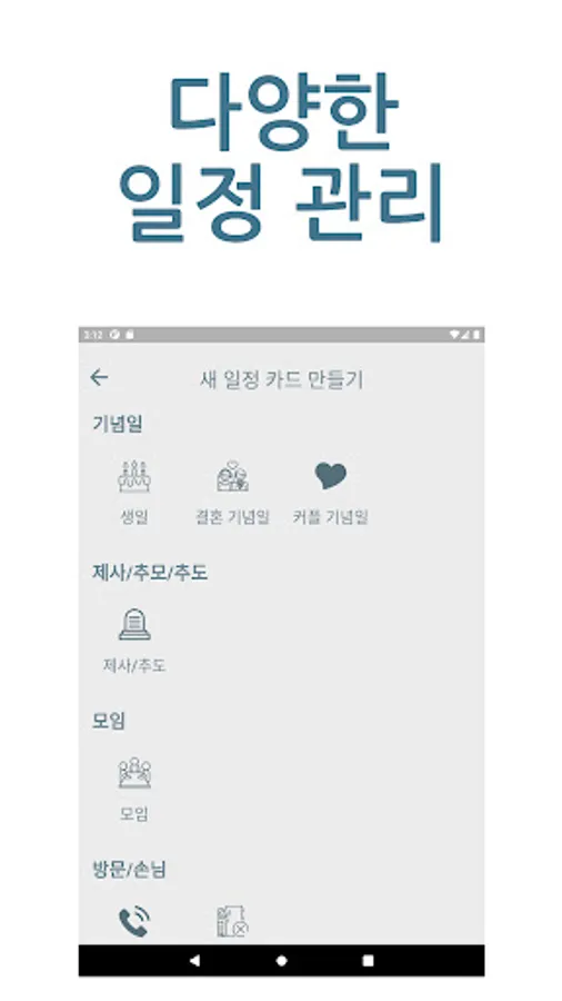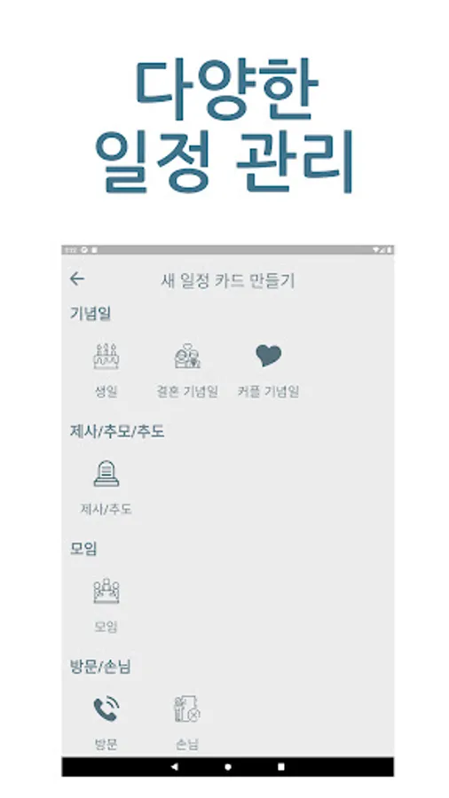 All schedules are managed by topical schedule management cards such as birthdays, couple anniversaries, wedding anniversaries, meetings, gatherings, visits, and various D-days.