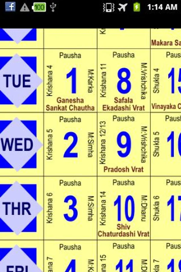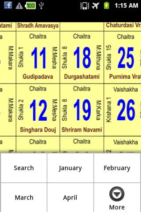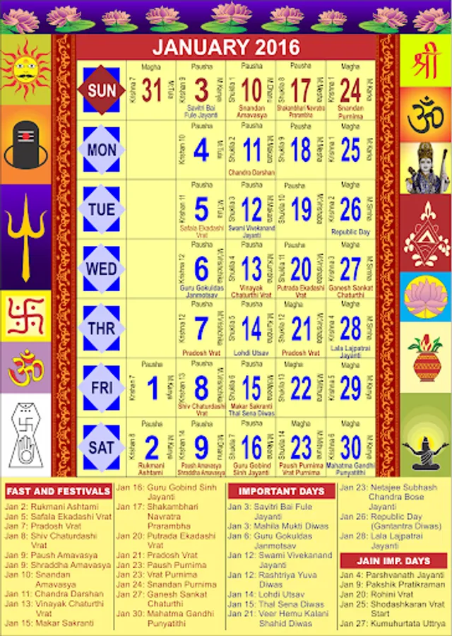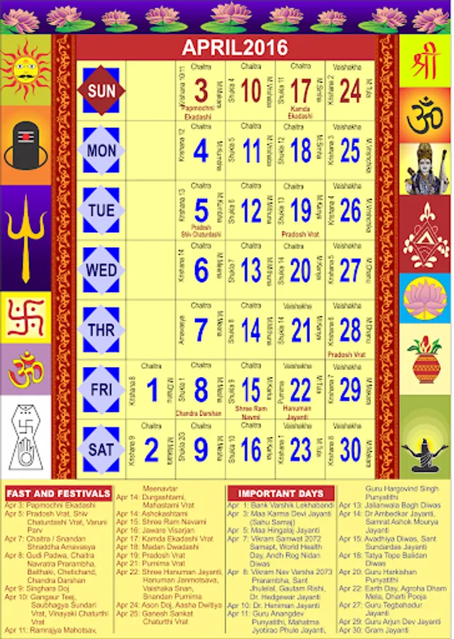 Hindu Calendar shows tithi, paksha, nakshatra, rashi and the phase of the moon.