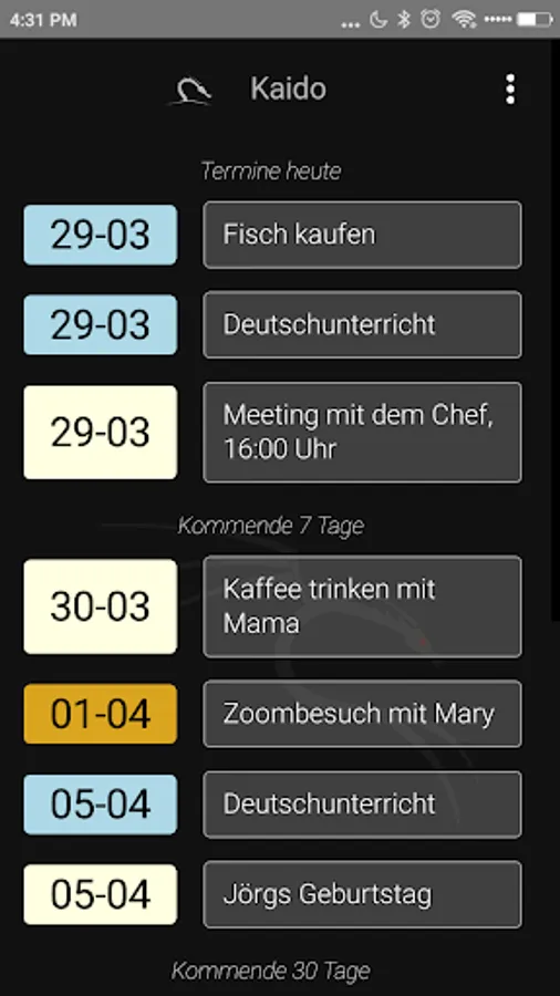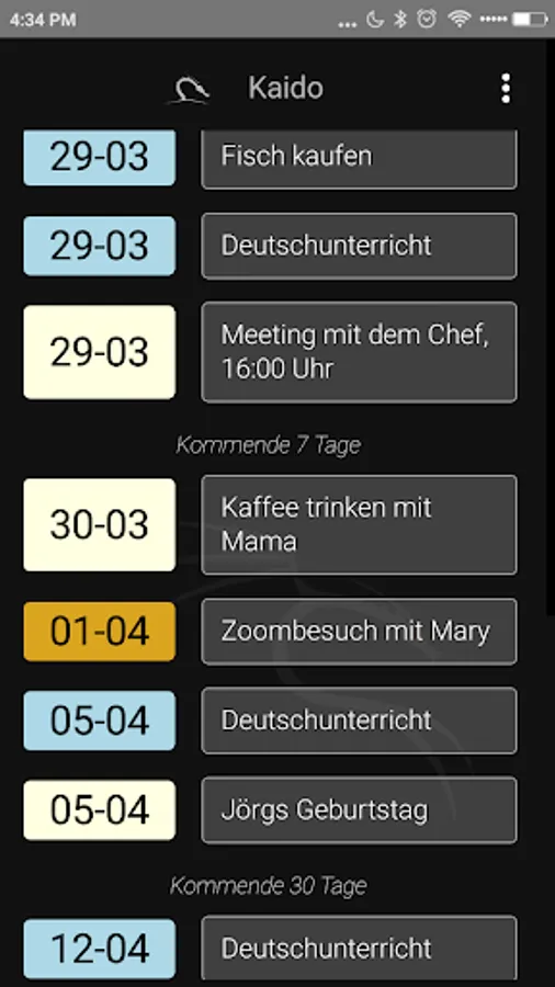 The dates are stored on the device itself. The application does not have access to contacts, emails or social networks, and collects or transmits any data.