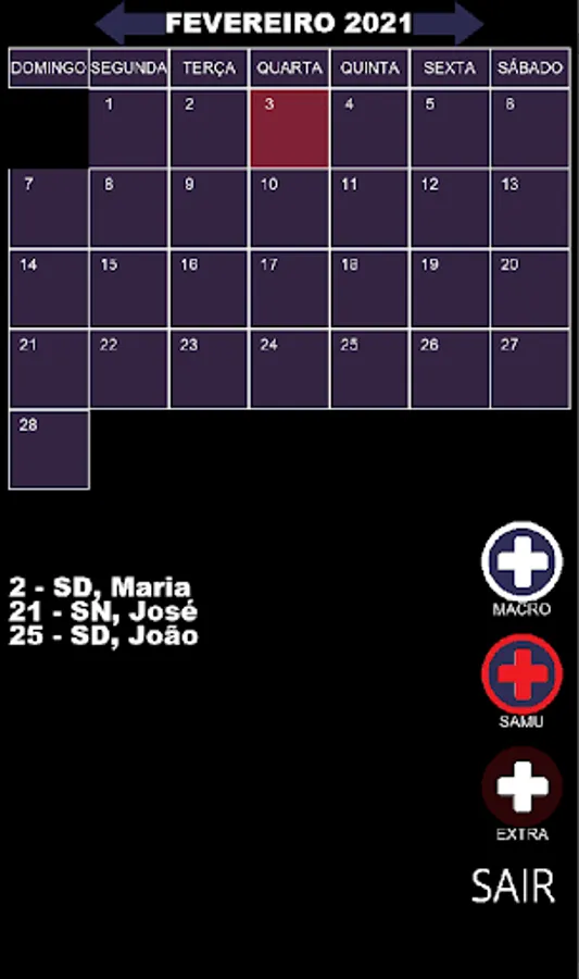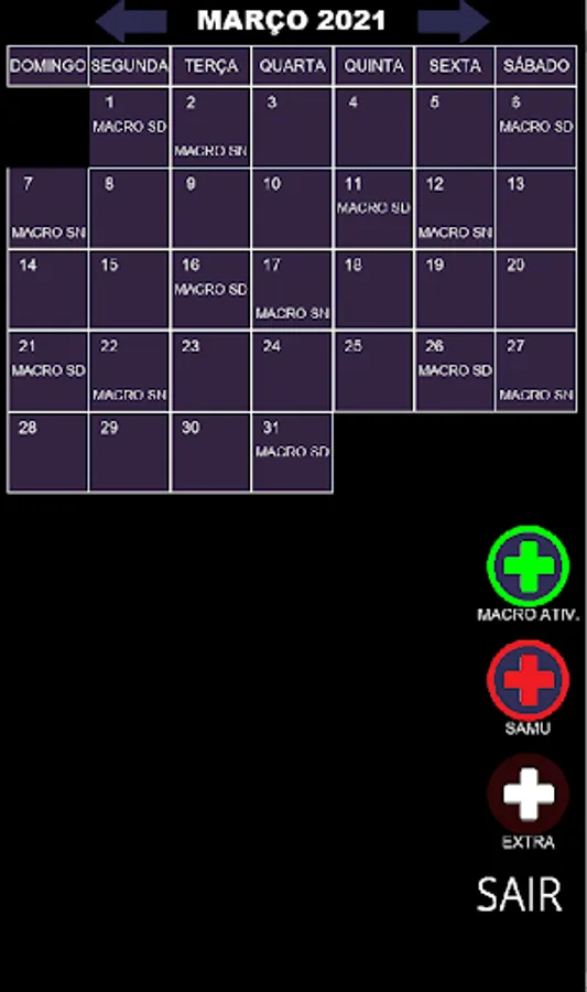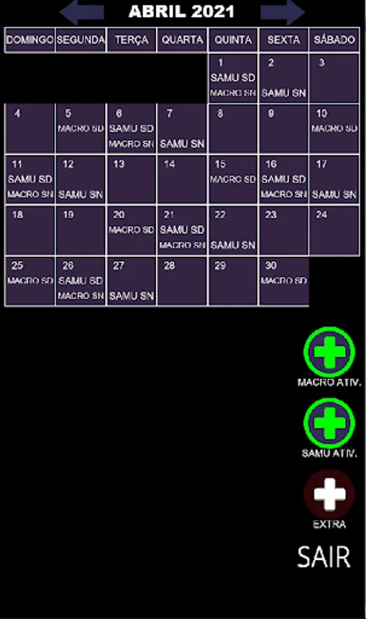 This calendar was created for health workers who intend to monitor their shifts and who are working in two workplaces, Macrorregional and SAMU.