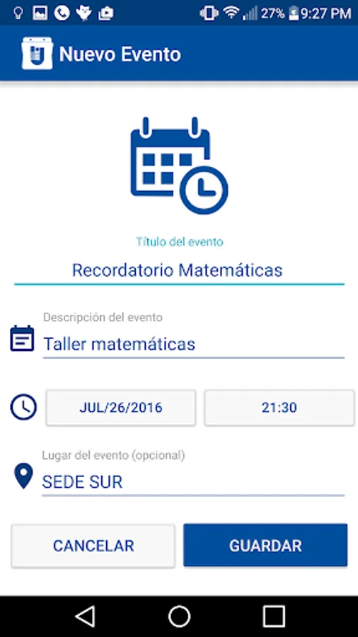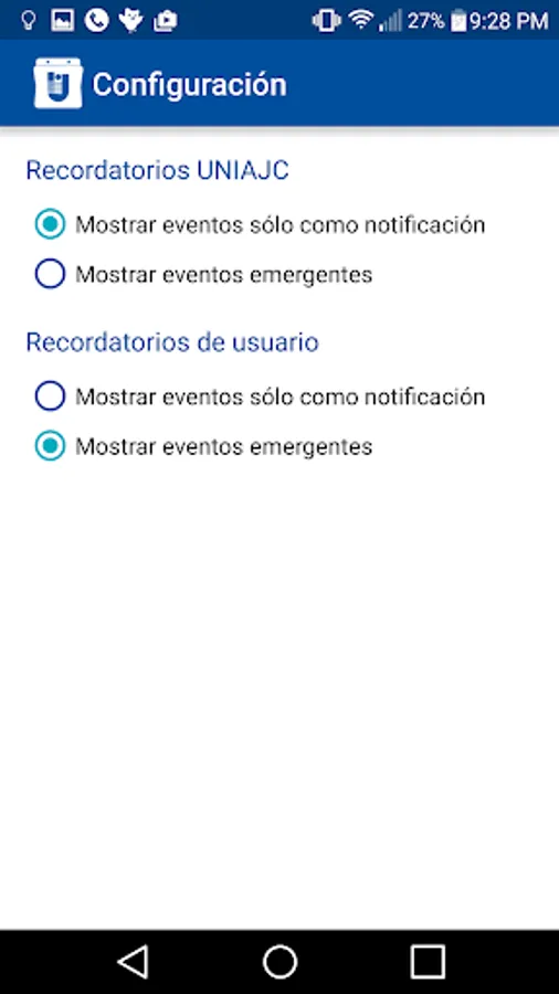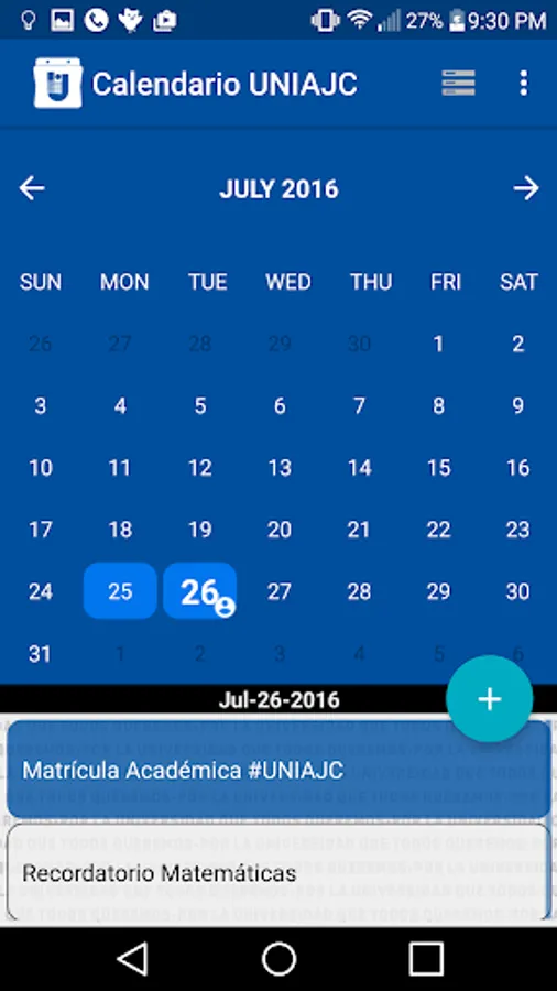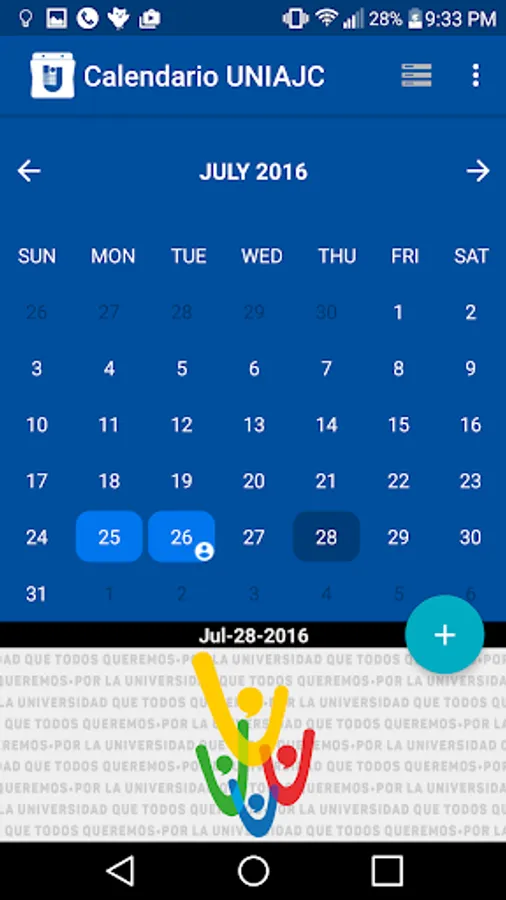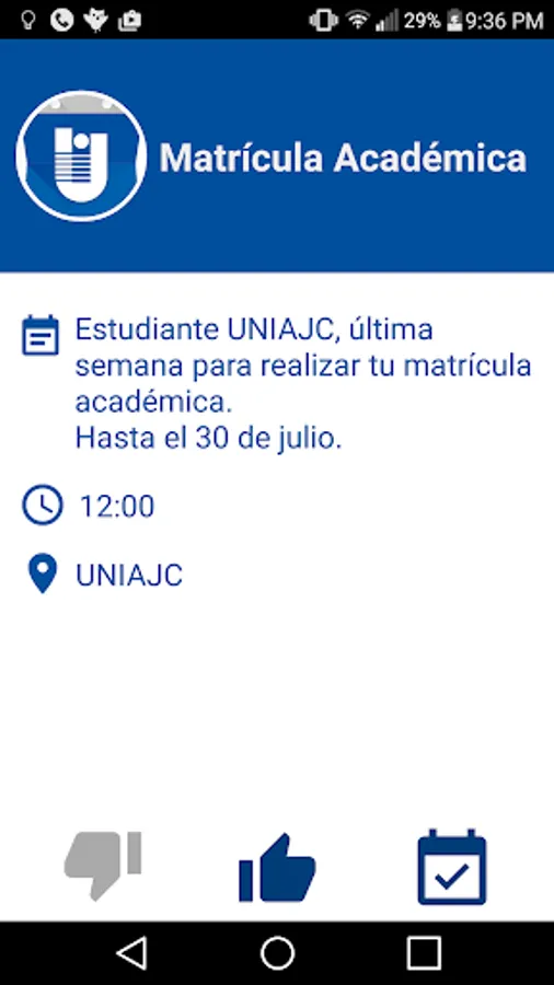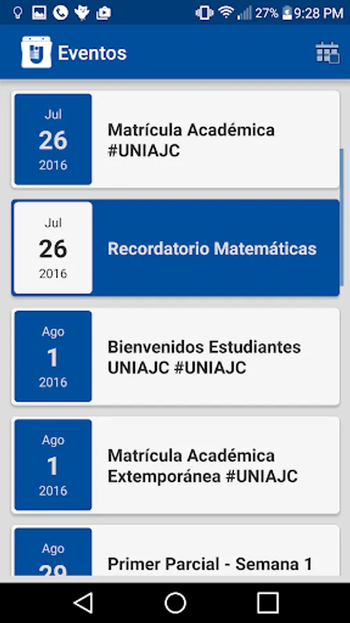 University now have in your hand, you can keep up with the most important events of the UNIAJC. UNIAJC Calendar lets you check the dates of upcoming events as partial dates, supletorios, cancellations of courses, dates and graduation ceremonies. In addition, you will receive notifications and alarms for each of these events so you're always up to date with your university.