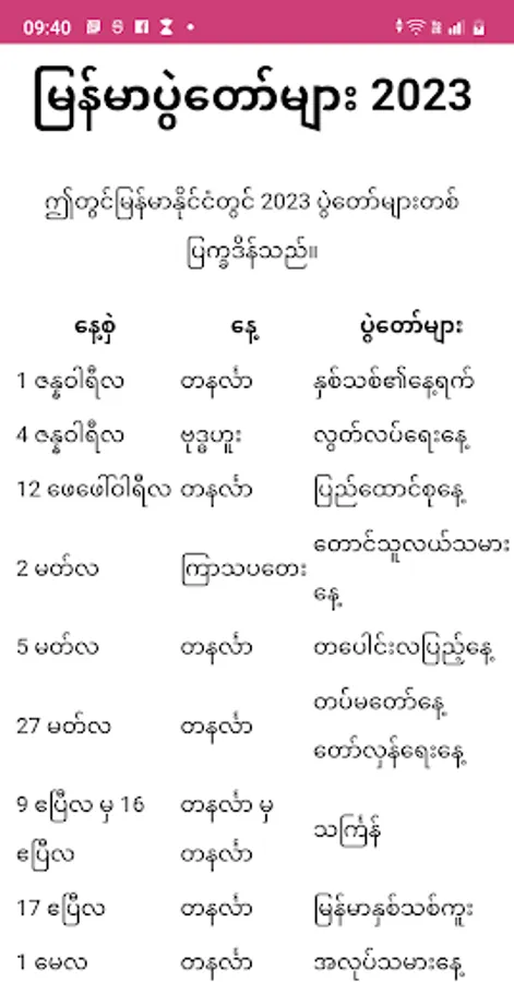 This Myanmar Calendar 2023 brings you daily calendar in Burmese language, English horoscope forecast, Myanmar Govt and Bank holidays list, Myanmar festivals, puja, cultural celebrations, etc.