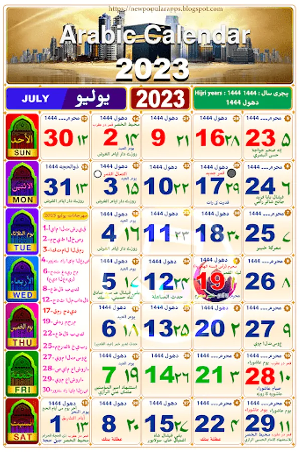التقويم العربي الإسلامي 2023 التقويم الهجري 1444 تواريخ شادي 2023