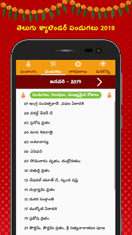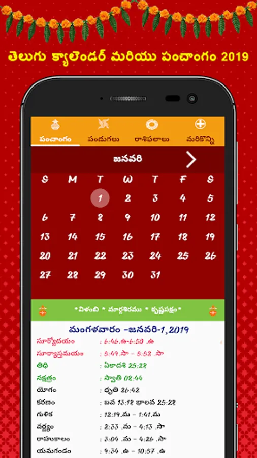 Telugu Calendar 2022 with Panchangam app comes with two partitions, at top you can view and operate calendar dates month and year, and at the bottom you can check the details of the selected date. You can even check the holidays, important dates, festivals and many more in festival section month wise.
