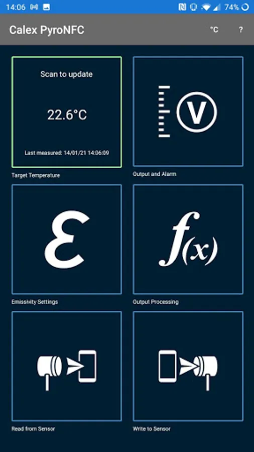 See continuous in-app temperature updates and configure the settings of Calex PyroNFC infrared temperature sensors.