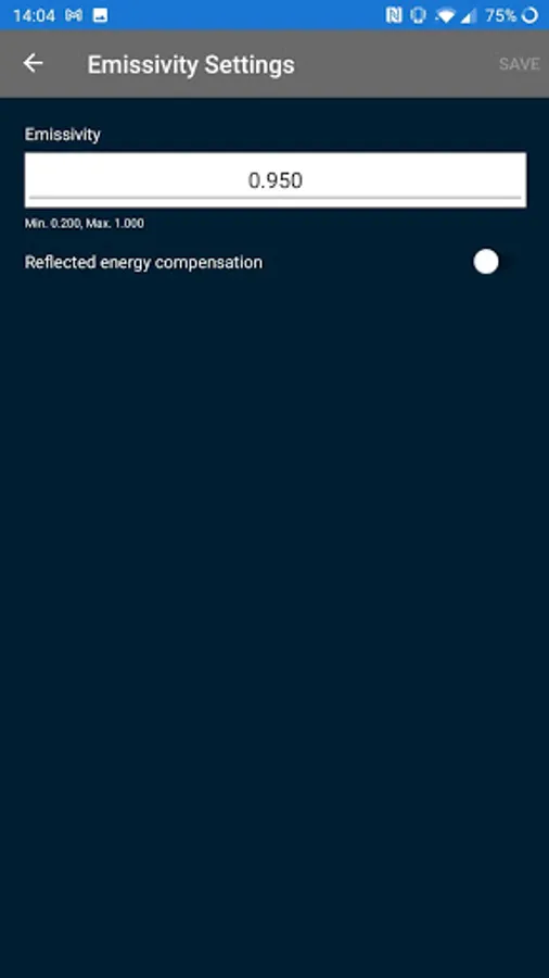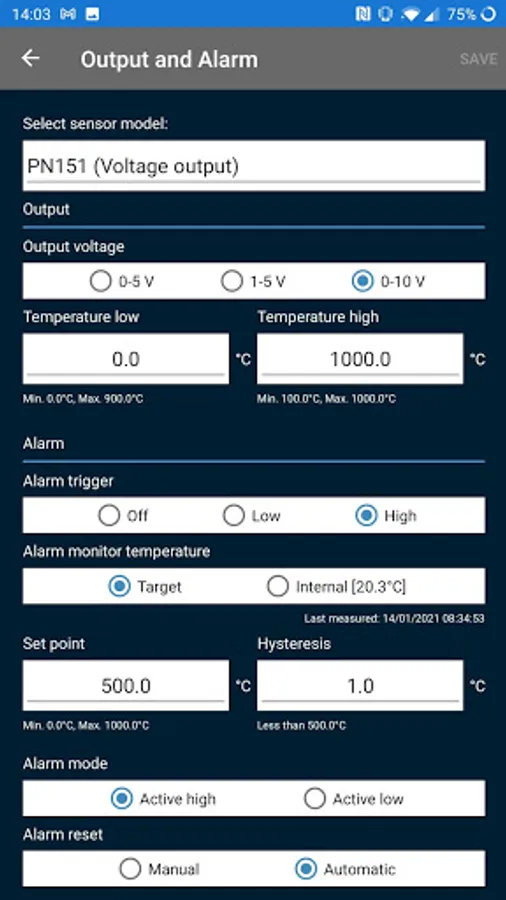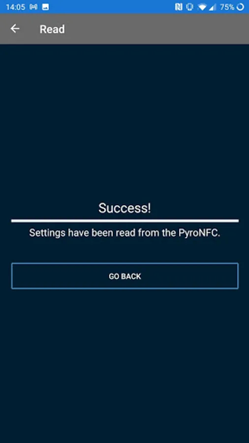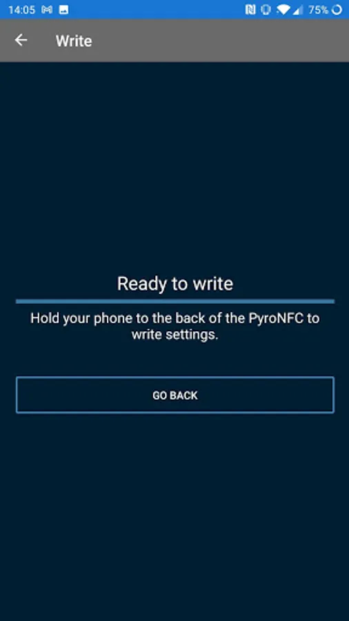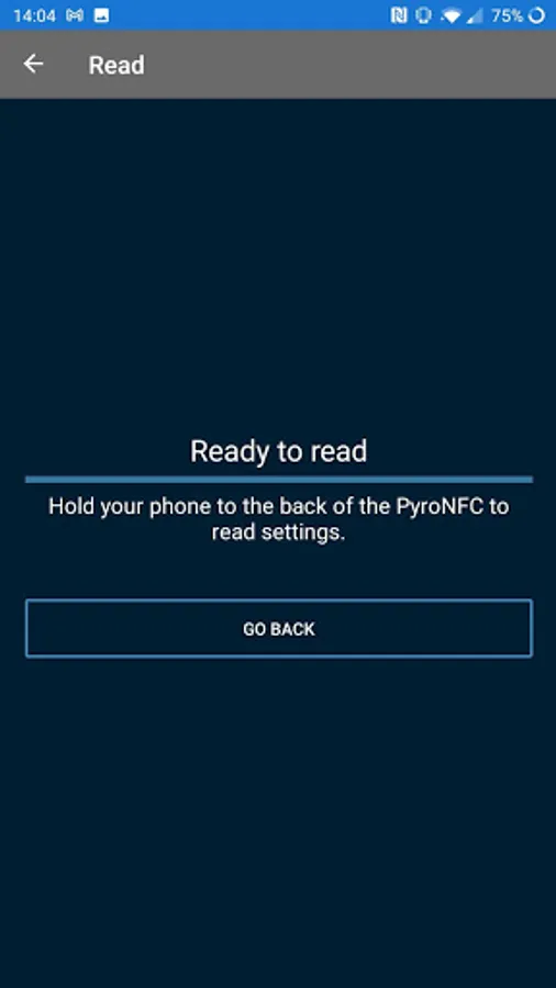 Save settings to your NFC device, and tap the PyroNFC sensor with the device to transmit them. Settings are saved even if the sensor is not powered.