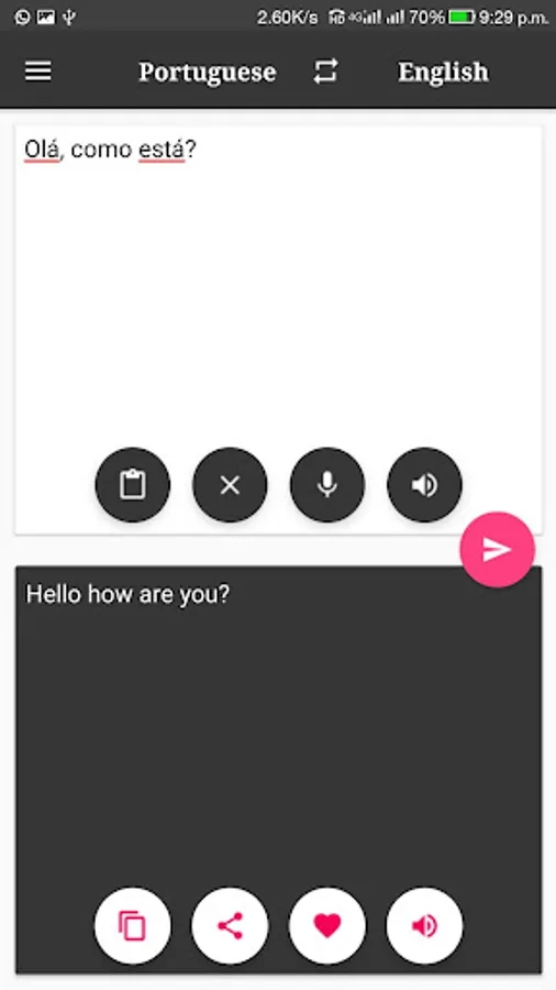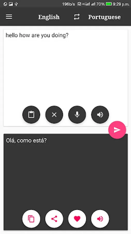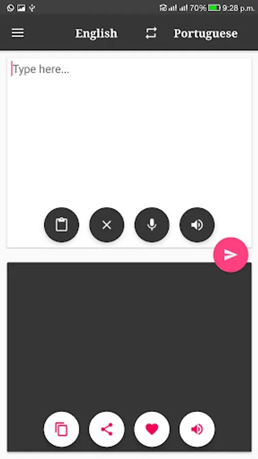 * App works in both mode, Portuguese to English Translator or English to Portuguese Translator.