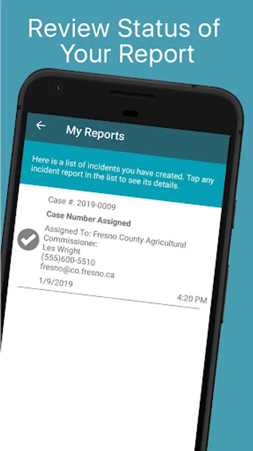 This app streamlines the process for you to submit a pesticide related incident report. Depending on the details of your incident report, your report will be sent to the Department of Pesticide Regulation or directly to the Agricultural Commissioner of the incident county for further investigation. If your incident report requires more information, somebody from DPR or the Agricultural Commissioner’s office will be in contact with you.