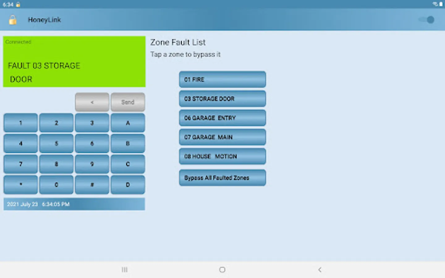 The Zone Fault List feature displays all faulted zones as a list of buttons that can be used to bypass a faulted zone.