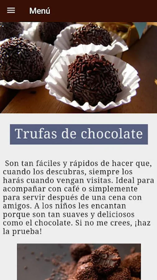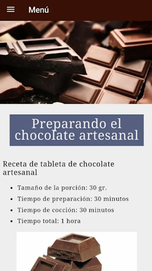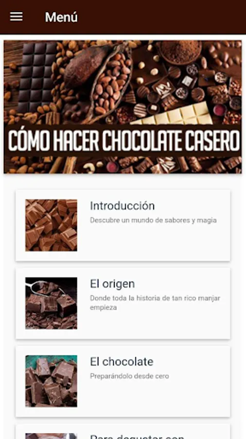 The "How to make homemade chocolate" app has recipes that range from the preparation of chocolate to the fantastic desserts and delicacies that can be prepared with it. Here's what you'll find: