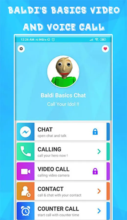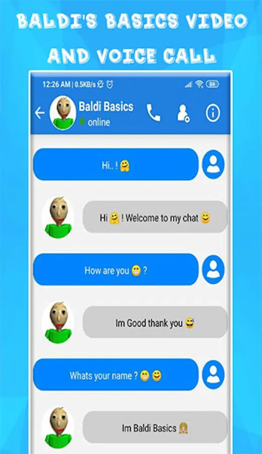 baldi game Call and Fake Video & baldi Chat is an excellent application directed to fans baldi game. It is effortless to use choose your option baldi calling video and chat, create a super discussion chat with baldi video calling, and texting conversation.