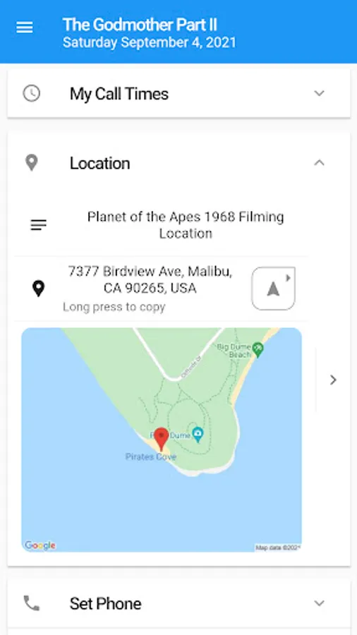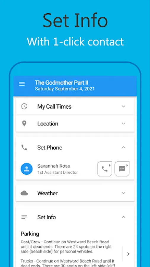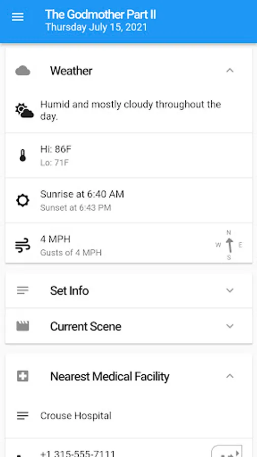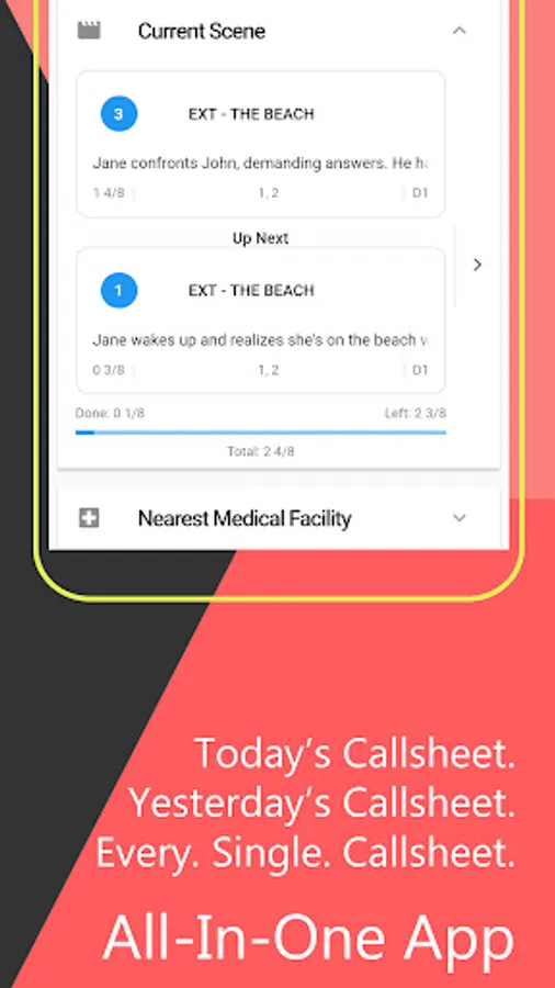 Home screen with your individual Call Time, Shooting Call, and 1st Meal.
