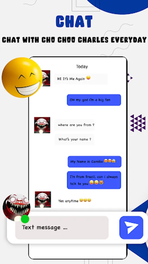 Choo Choo Charle Chat talk Game allow you to receive a prank call from your favorite idol scary Choo Choo Charles, Black Choo Choo and the tailes in such a realistic way that no one can guess that it's fake and will cheer up all of your relatives and friends, and family.