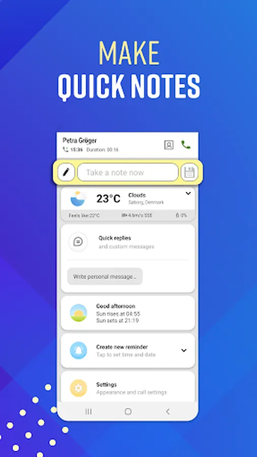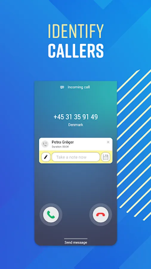✔ Useful call information screen where you can write a quick note, save the number to your contacts, call back, send an SMS, and more!