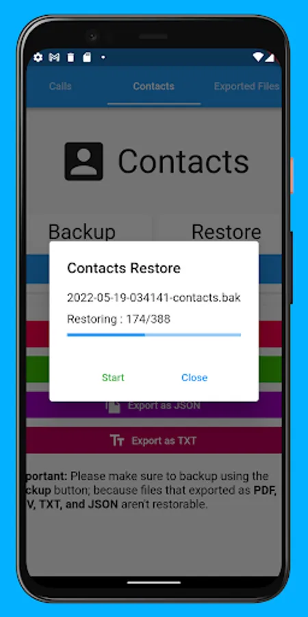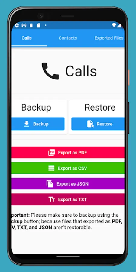 NOTE: Not all the exported files are restorable, Restorable backups are made only from the “Backup” button.