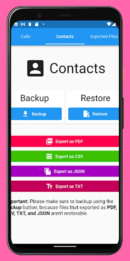 Export your contacts as PDF, JSON, TXT, and CSV.
