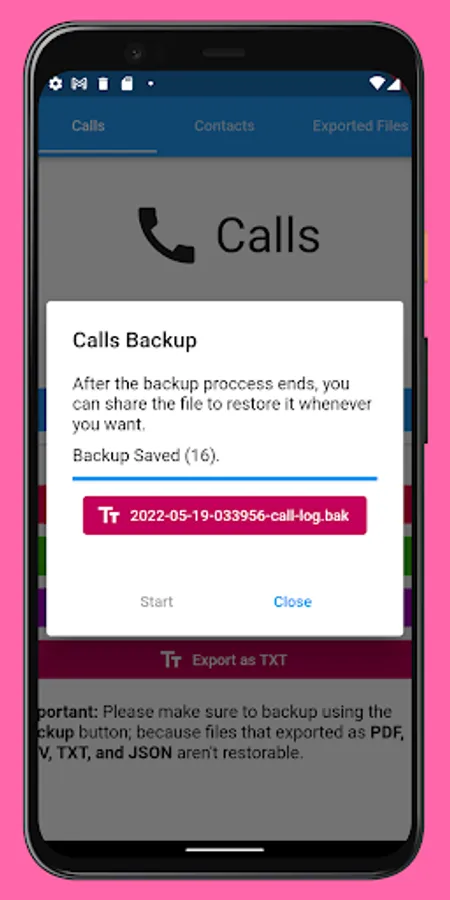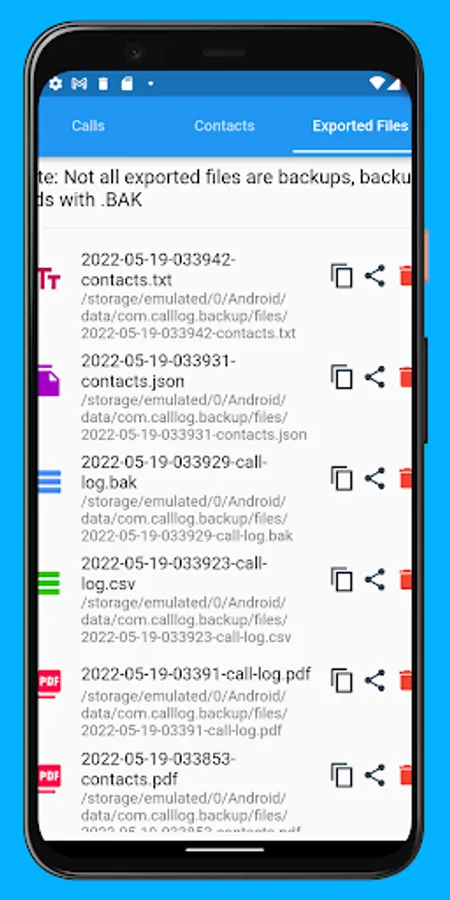 Every backup will be saved on your “Downloads” folder, and also on the application files, if you couldn’t find the file in the “Downloads“ go to the “Exported Files” page, click on the target backup and share it via mail or another application you like.