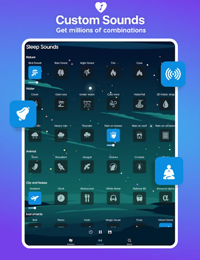 We bring the greatest collection of high-quality sounds that can be mixed into the best relaxing combinations. You can choose from various types of nature, rain sounds, water and animal sounds, deep meditation sounds and instruments, white noises, etc.