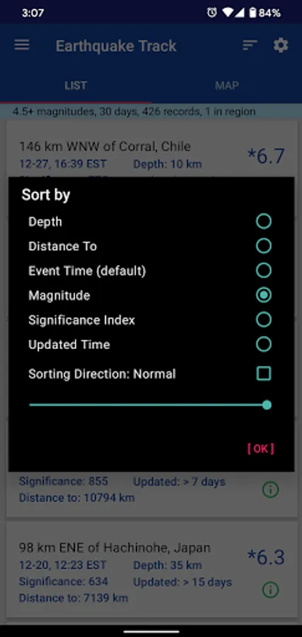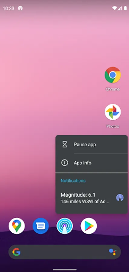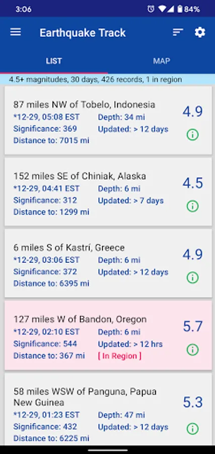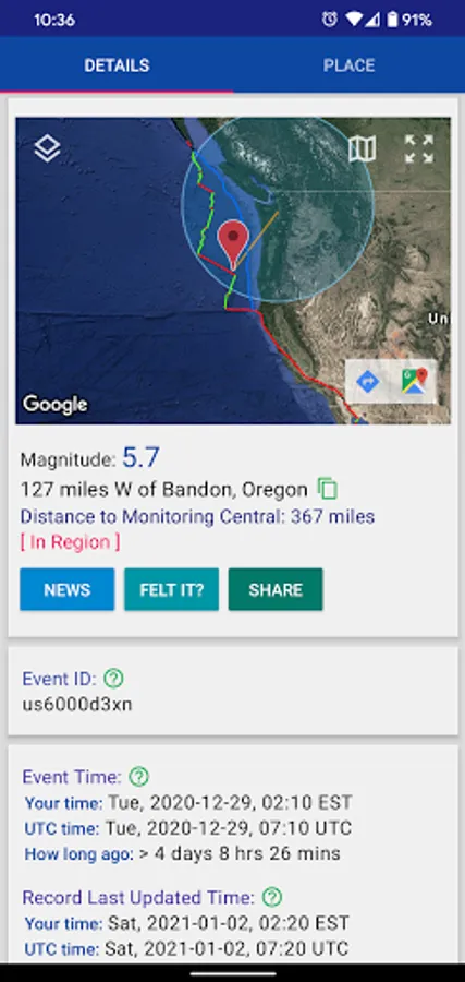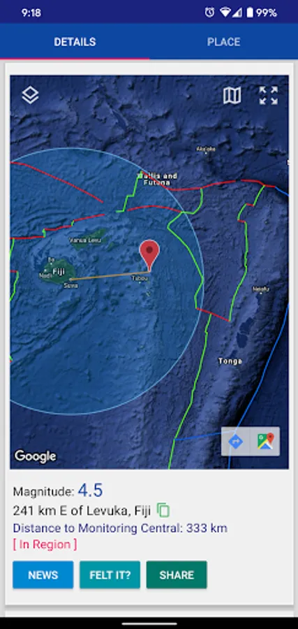 * Connect to the external Google Maps app to look up further details, including the fastest routes to reach the earthquake locations.