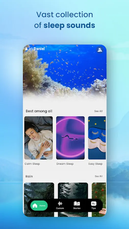 Relax your mind and sleep better with sleep stories, lo-fi music, nature sounds, and stress-buster music. After a busy schedule, we just want peace and relaxation and for that, you can use this amazing feature “Custom” where you can create your own space by customizing different relaxing sounds in one.