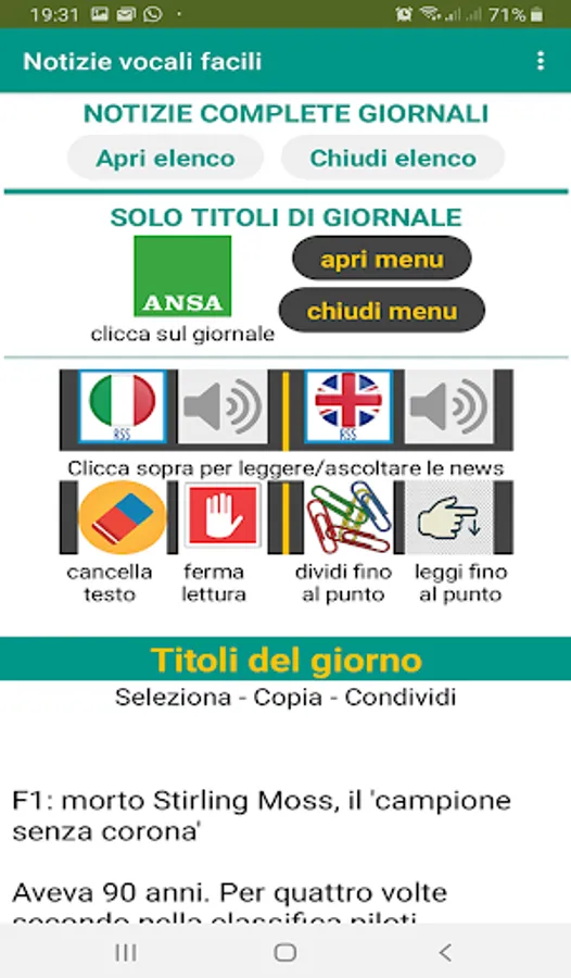 The Easy Voice News app - Italian and English is the first app that reads RSS news hands-free. The app is totally free, contains no ads and is easy to use. With this app you will always be updated on the latest news from Italy and the world. It allows you to browse the main national and international newspapers and listen to the headlines of RSS news.