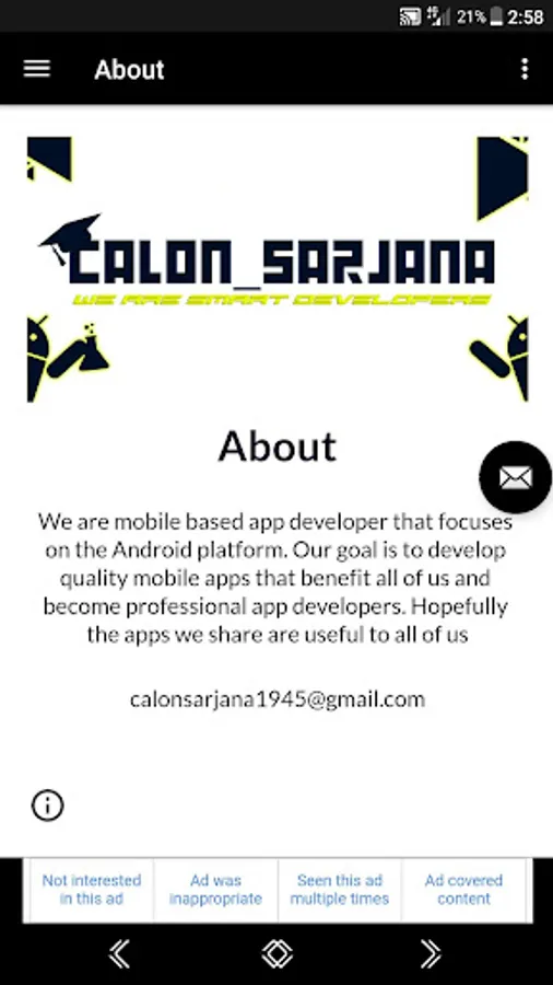 For the development of this application, if there are criticisms and suggestions please send an email to Calonsarjana1945@gmail.com.