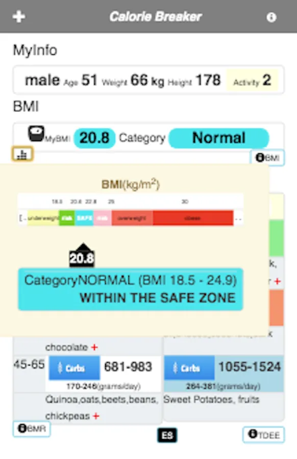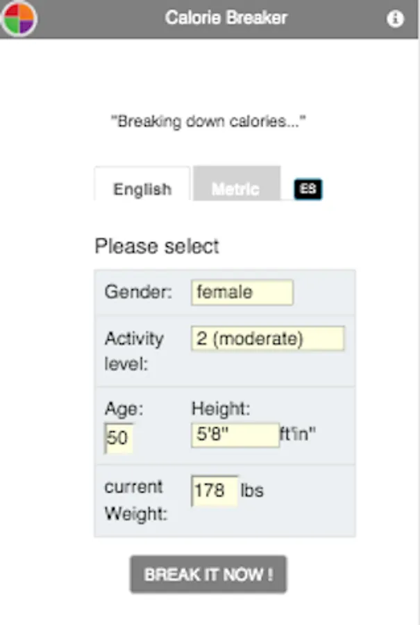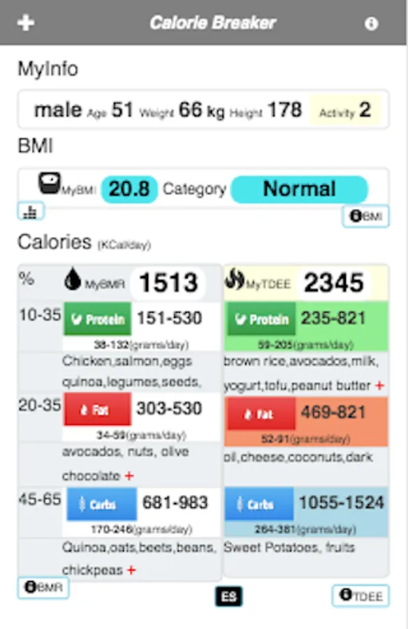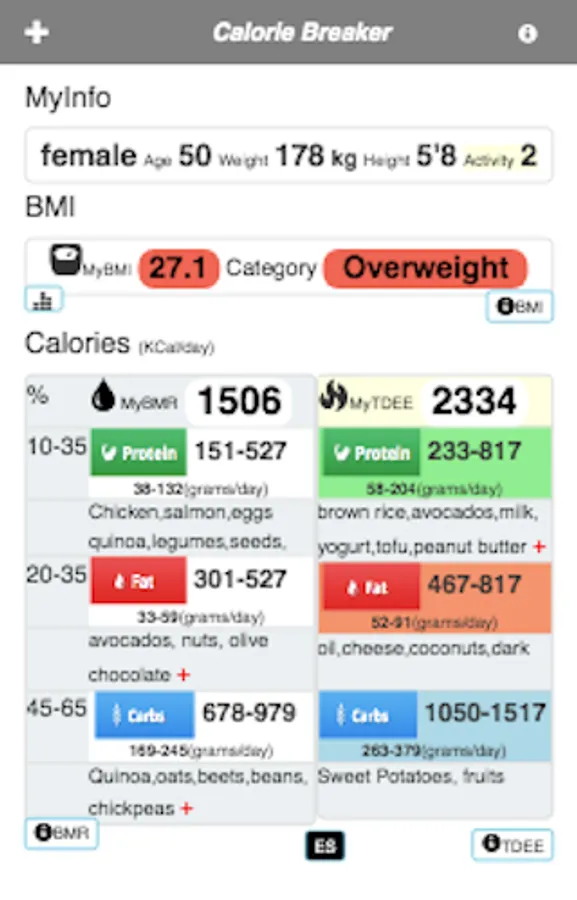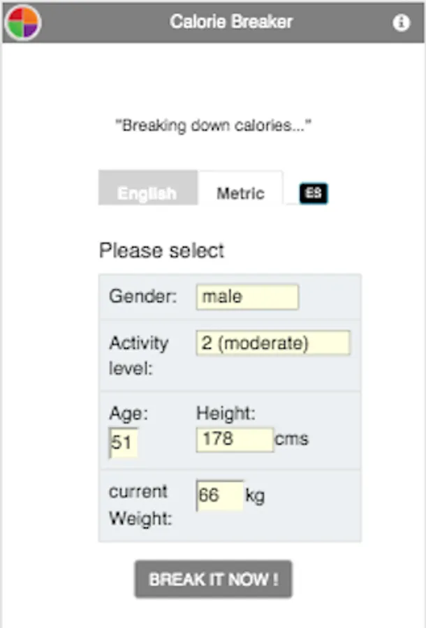 2) Then "Calorie breaker" breaks down your calories into carbohydrates, proteins, and fats need, either by KCal/day or Grams/day, for achieving and maintaining a healthy weight