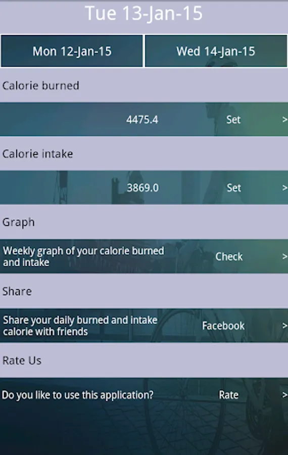 Use this app to calculate how many calories are burned during specific activity or exercise and how many calories are taken through specific food. Hundreds of day to day activities are listed. Hundreds of dishes with their calorie values are added. Also there is graph function to monitor day to day intake and burning of calories.