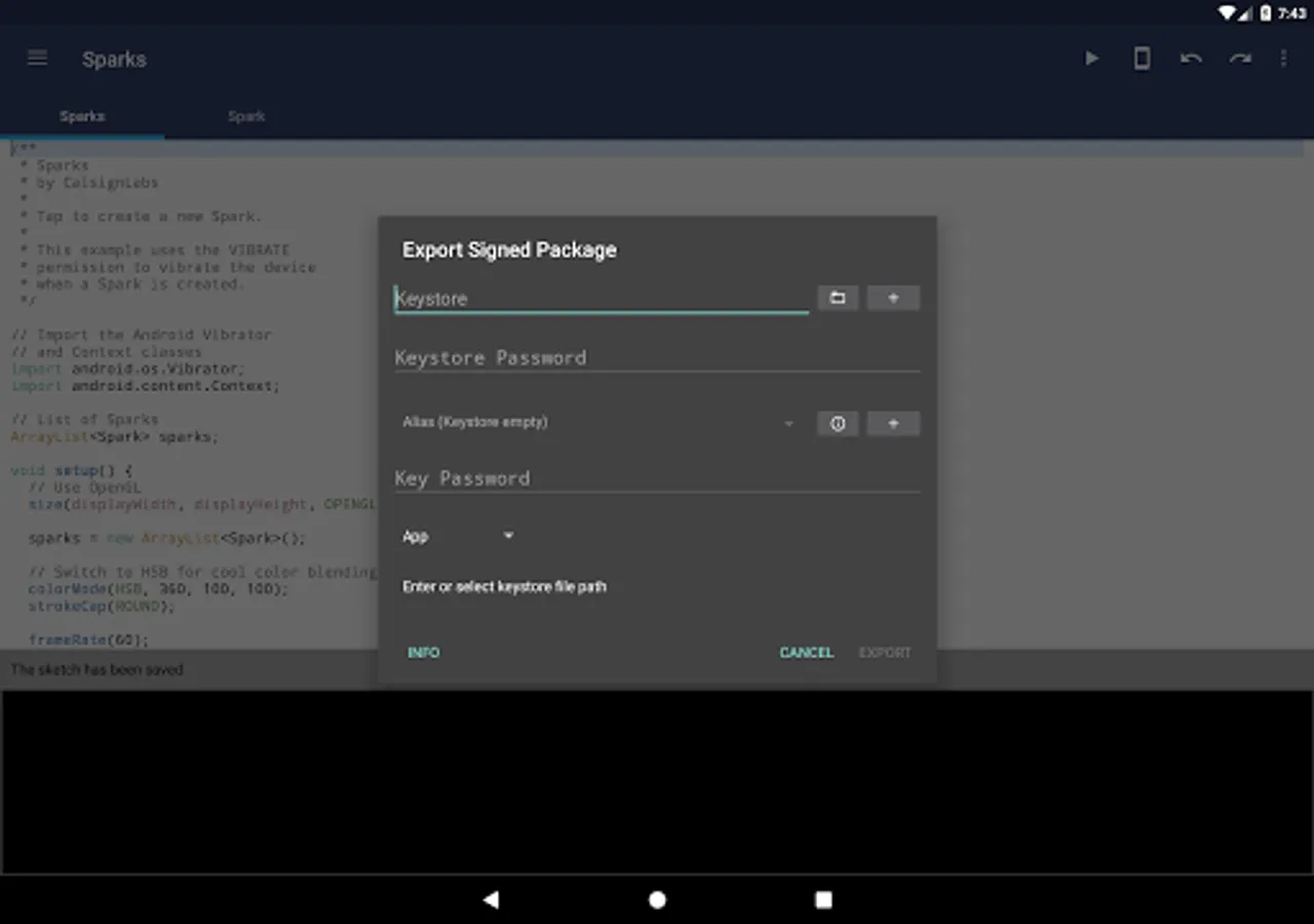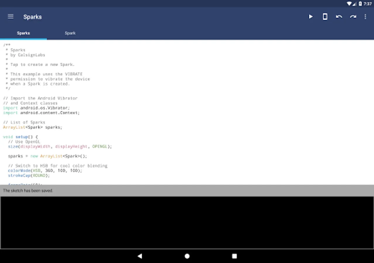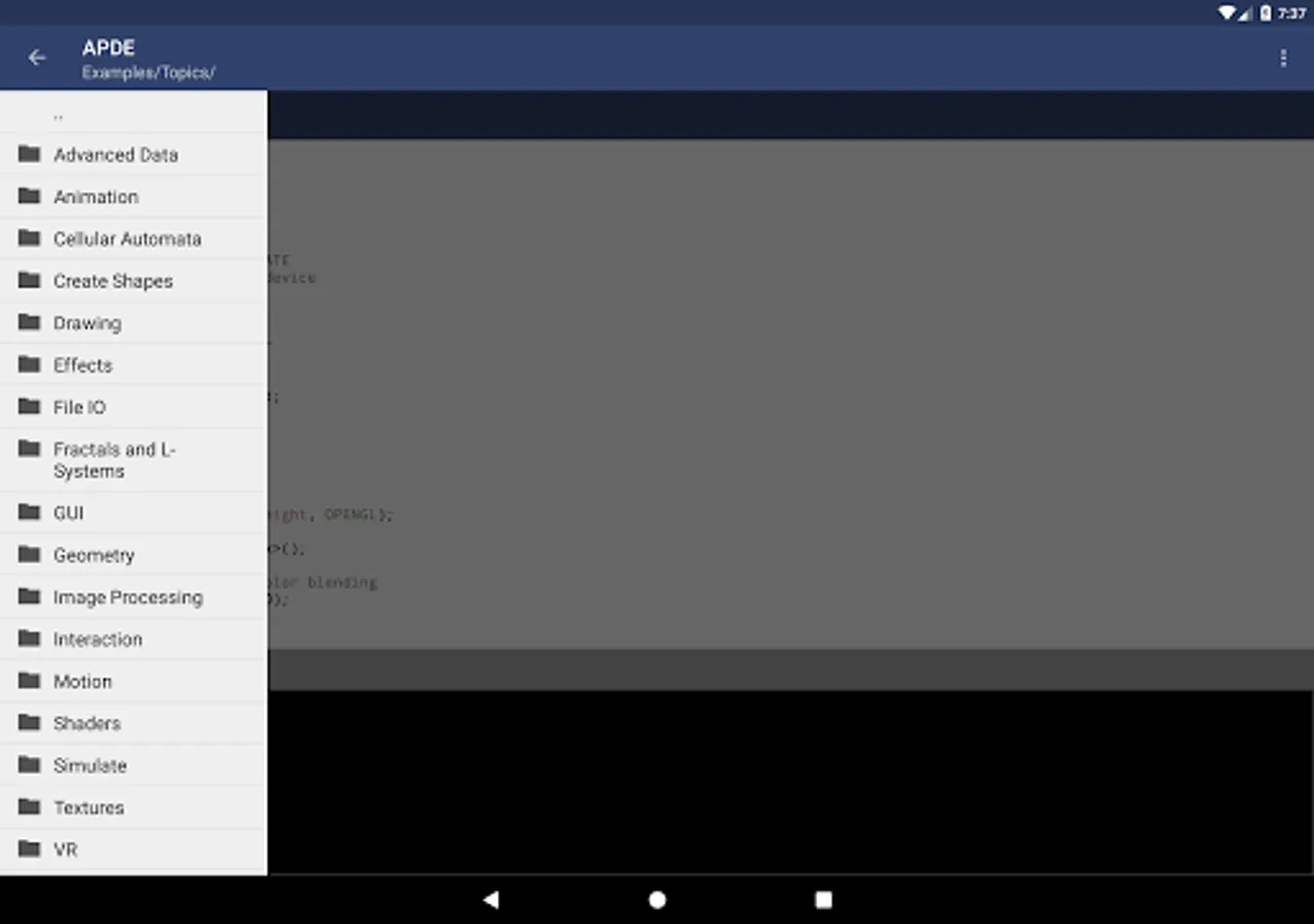 APDE (Android Processing Development Environment) is an integrated development environment for creating Processing sketches on your phone/tablet. APDE supports the full edit, compile, and run cycle. You don't need a computer or an SDK to start coding on the go.