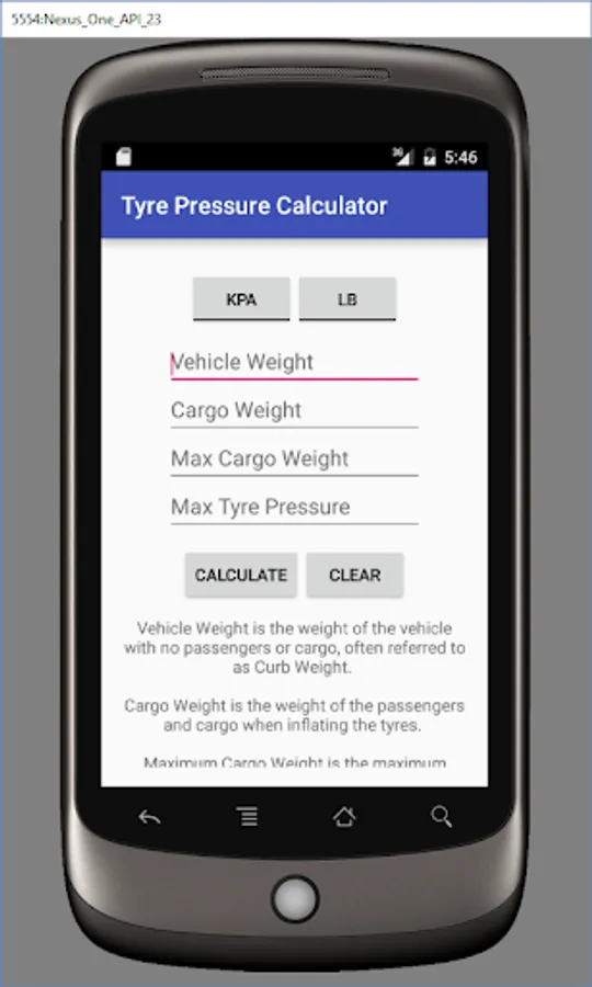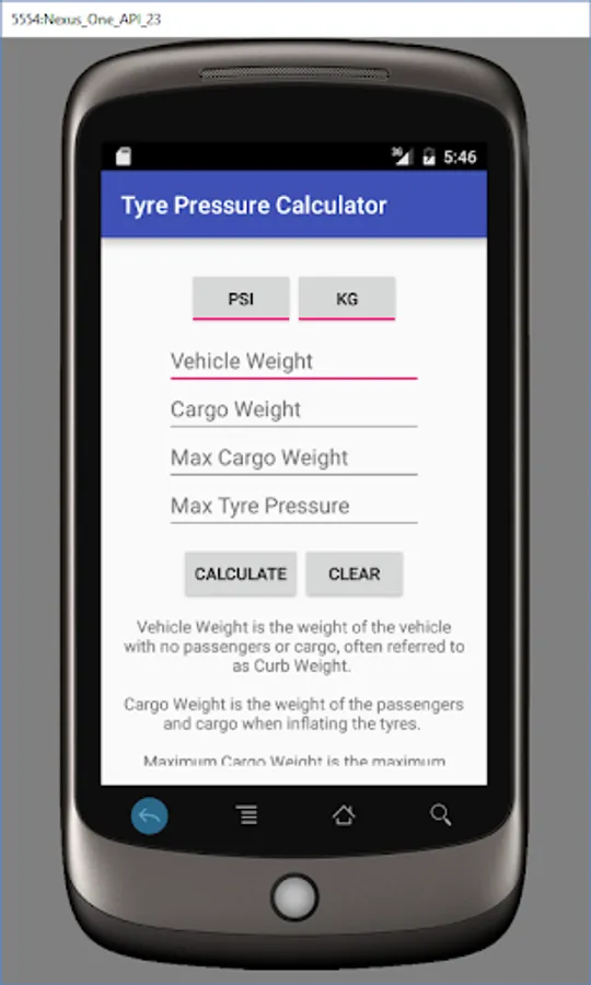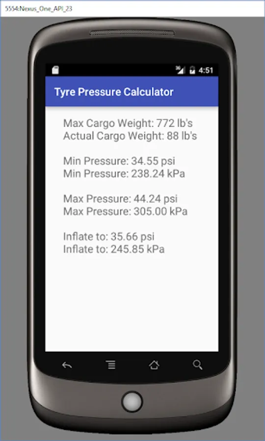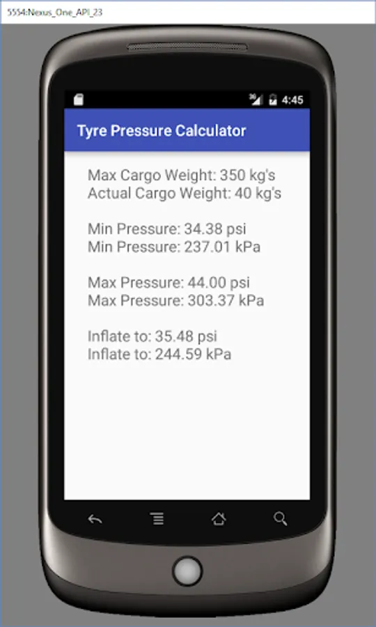 This app calculates the pressure to inflate your tyres based on the weight of the vehicle and cargo and the maximum pressure recommended for the tyre. You can input weight in either kilograms or pounds and input pressure in either kilo-pascals (kPa) or pounds per square inch (psi). The result is output in both kilo-pascals and pounds per square inch.