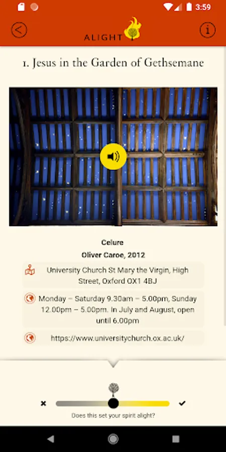 Alight invites you to take time to contemplate the works you alight on, and if they set your heart alight, you can capture your response with the Alight slider.