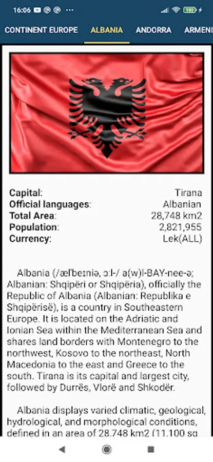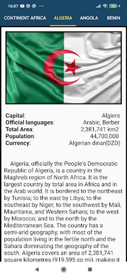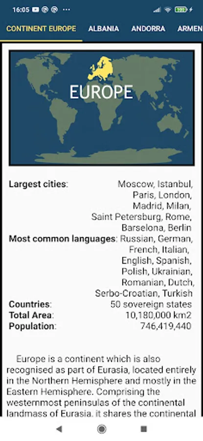 The capital of the country, the flag of the country, the area of the country, the population of the country, what language is spoken in each country and more. This is a mini wikipedia application that you can use any time you need this or that information about a country or continent.