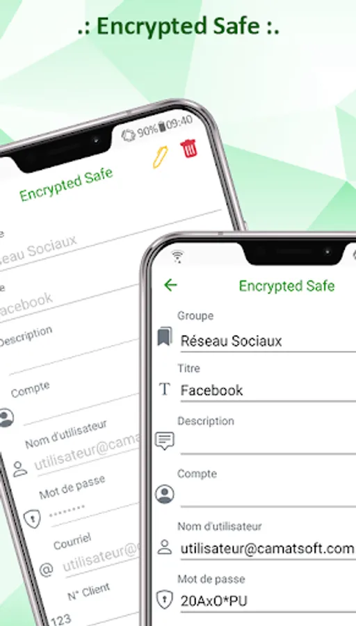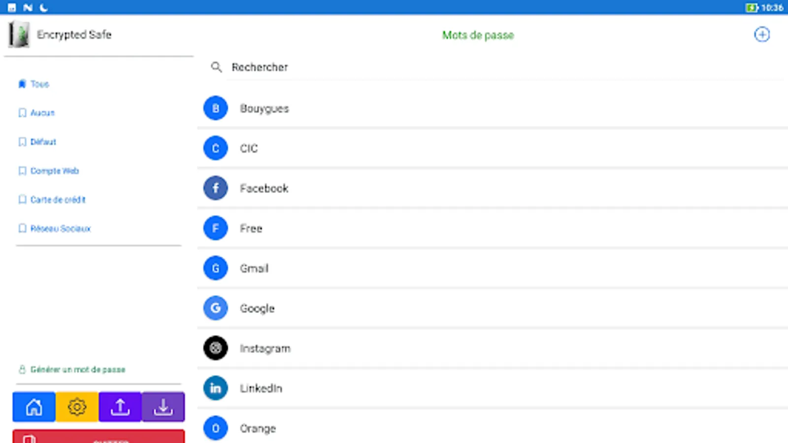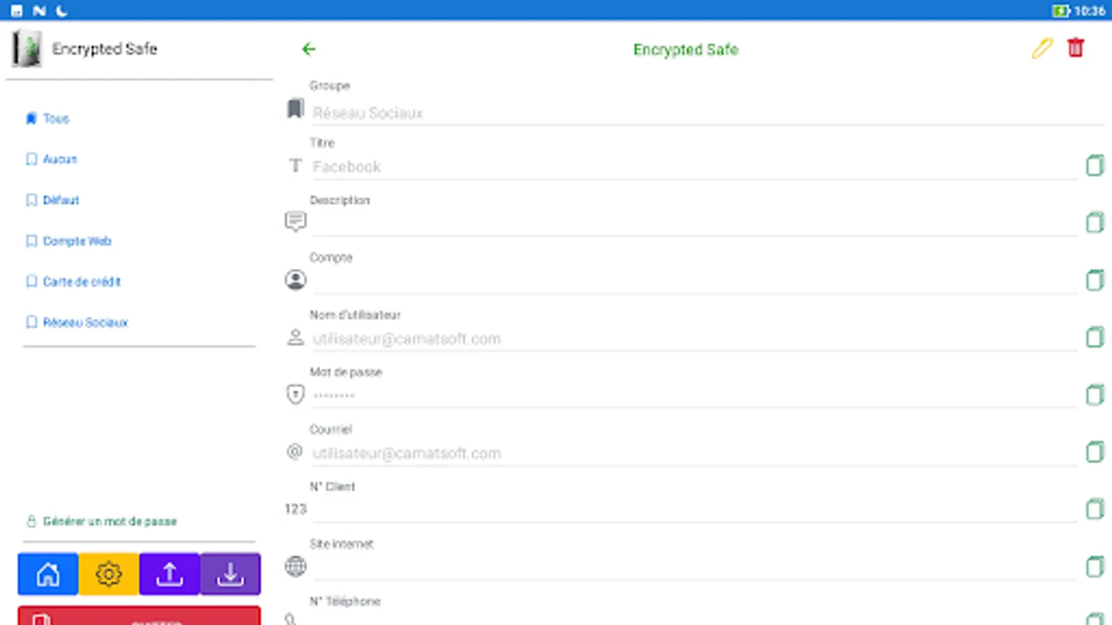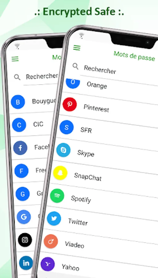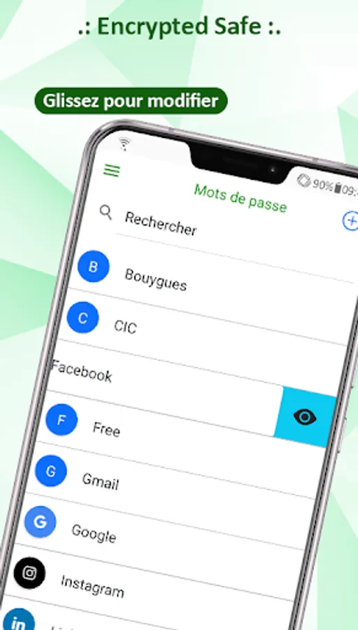 Then you can allow yourself to forget all that, "Encrypted Safe" is there for you, your fingerprint or your unlocking code will be enough to give you access to all your stored data, while encrypting usernames, emails, Passwords.