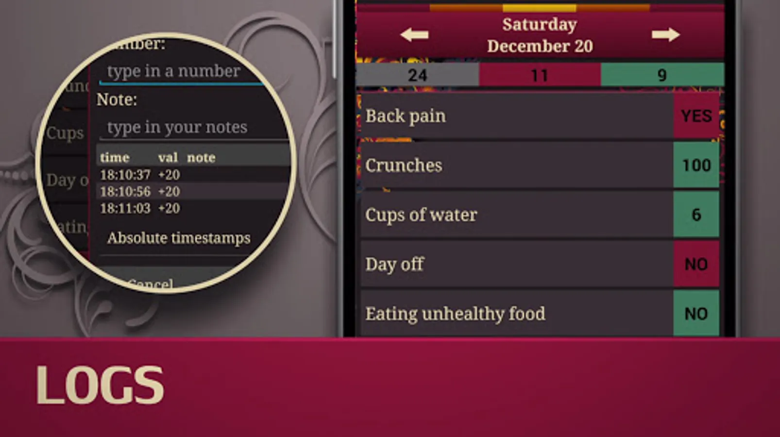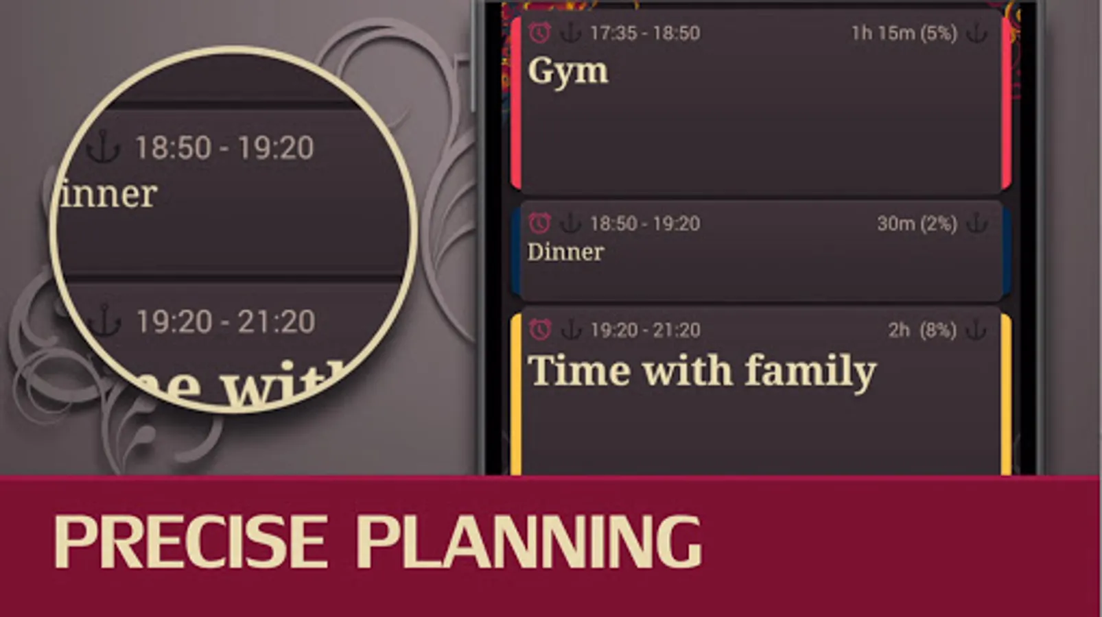 If you're diligent enough to create a complete plan every day, you'll see 24 hours is actually a lot. Based on your schedules you'll be able to generate and analyze useful stats, graphs and notifications. It will help you understand your current habits, set goals to improve them and stay motivated. You can monitor not only your time usage, but also other kinds of data that you put into a log.