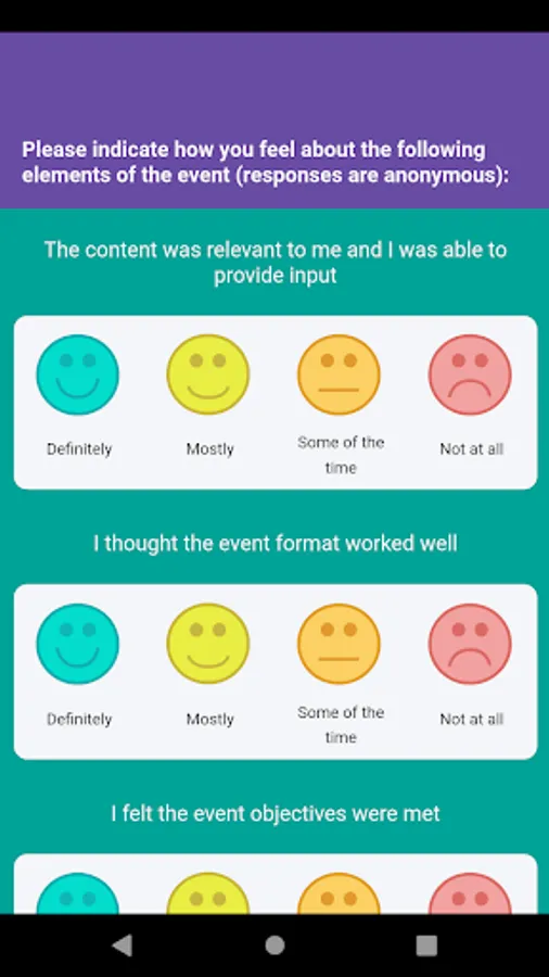 The Rate Today app is designed for organisations that run events, to enable them to get feedback from event attendees before they leave the event. Event attendees can provide quick and easy event feedback through a simple interface.