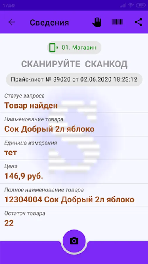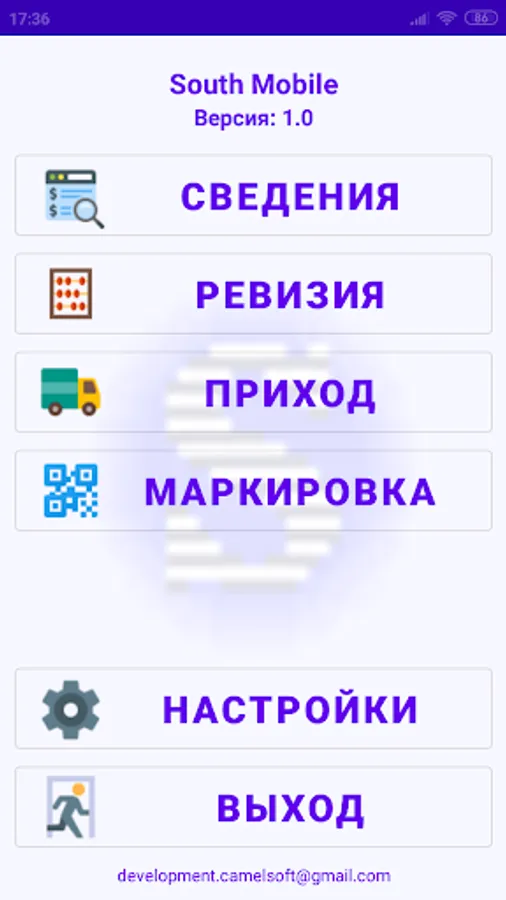 The application is a barcode scanner as an addition to the South software package. The program allows you to quickly receive information about a product, and also collects and organizes data for their subsequent use in revisions, receipts, expenses, orders.