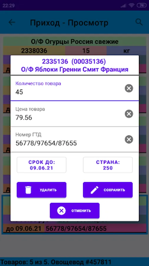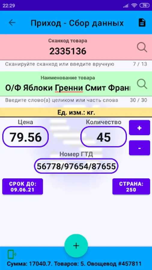 Correct the data already collected by quantity, price, CCD number, terms and country of origin.