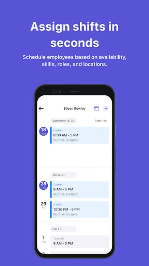 - Schedule staff and find replacements based on availability, skills, and roles