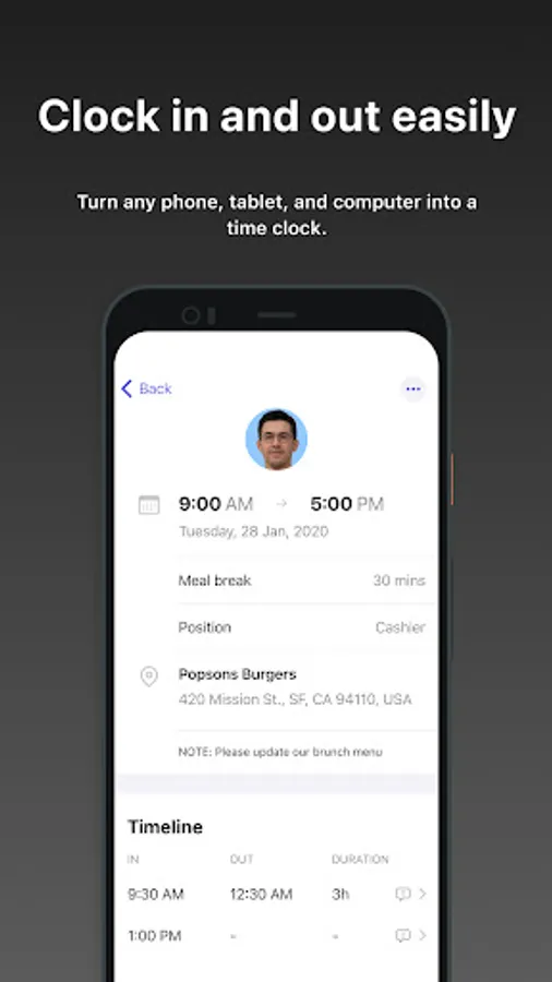 - Clock in and clock out from any device