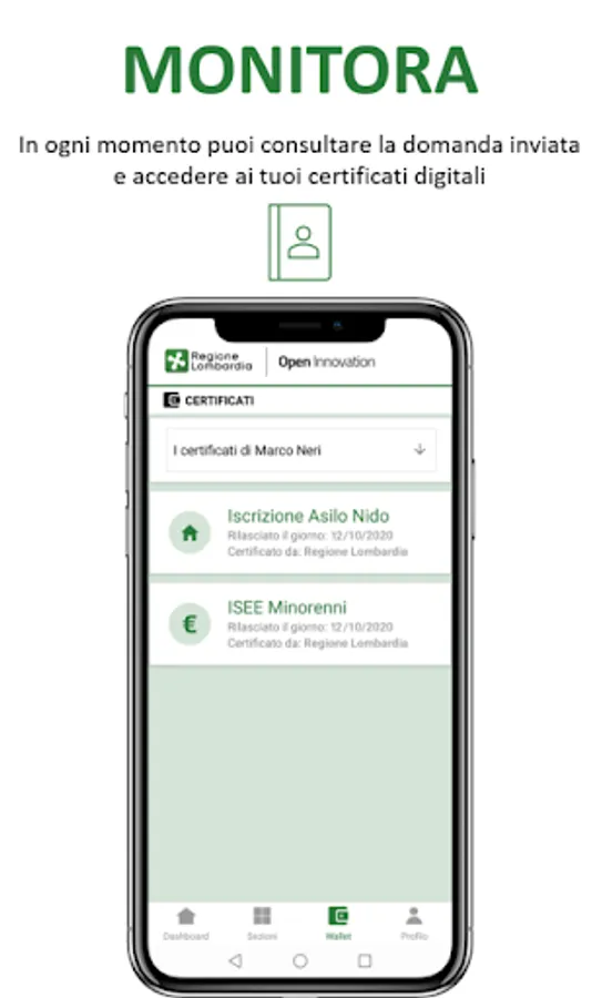 With the use of blockchain technology, the outcome of the verification is recorded in a secure and unalterable way, making it always possible to consult it in the future. The fulfilled requirements become digital certificates that you can immediately find in the "wallet" section and reuse later on other services of the Lombardy Region that will be accessible through the App.