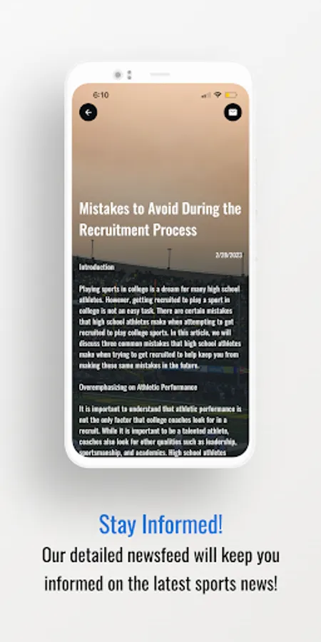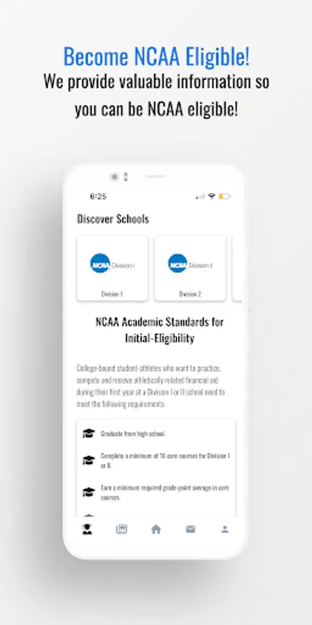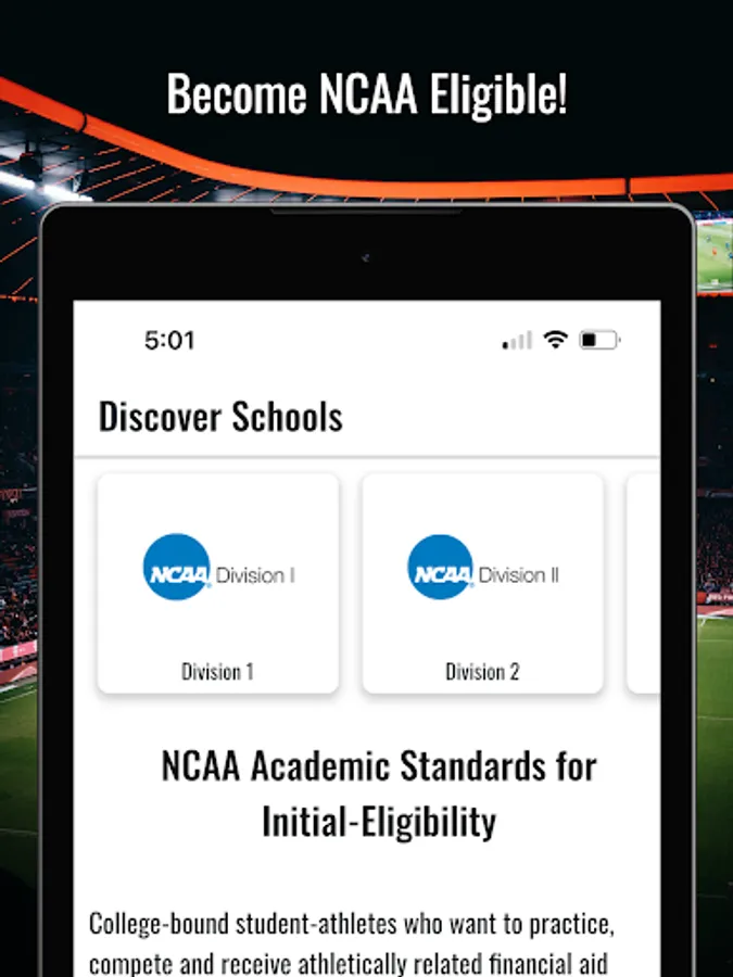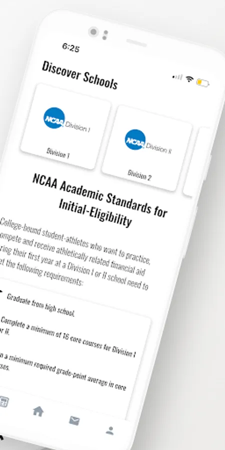 Another benefit of this app is a page focused on discovering schools. Users are able to view conferences and schools from NCAA divisions 1, 2, and 3. This feature will help athletes and their families discover schools that they may have not been aware of before. This page of the app also includes a section dedicated to NCAA eligibility. Important information regarding eligibility is available to all users of the app. This was created with the intent of simplifying the process that athletes must go through in order to compete at the college level.