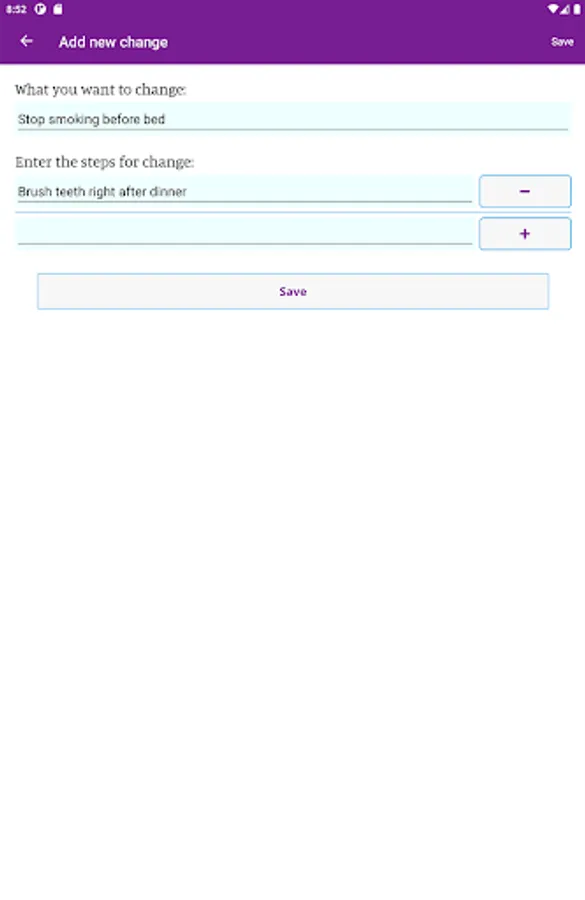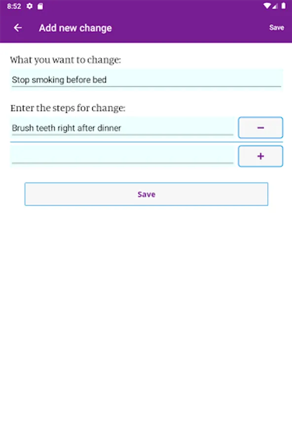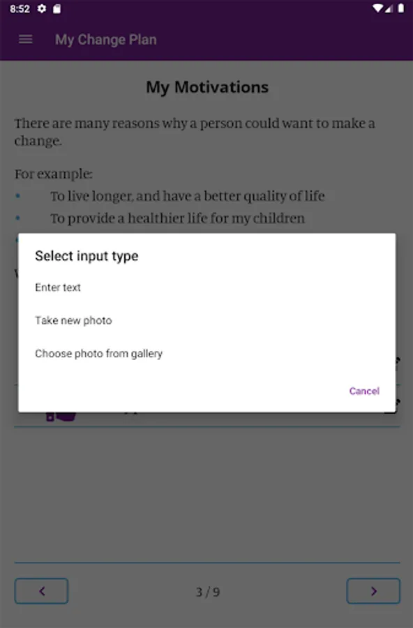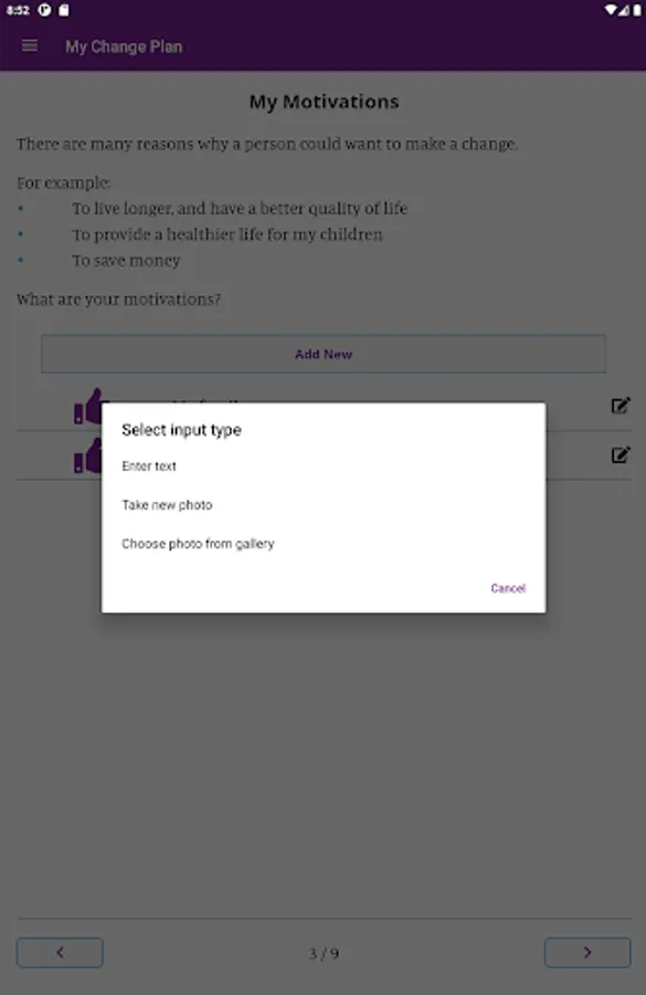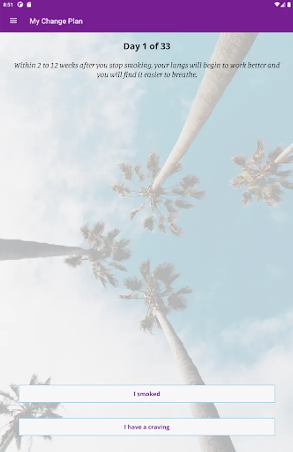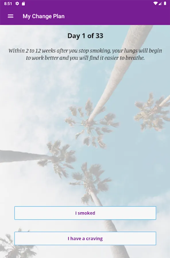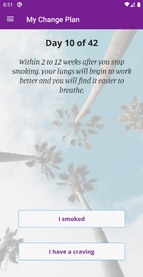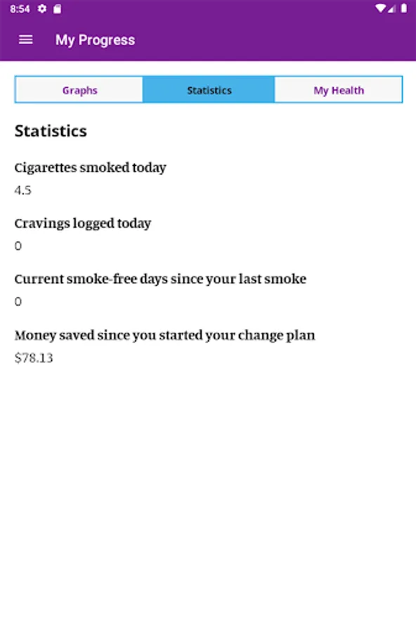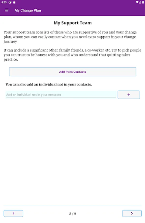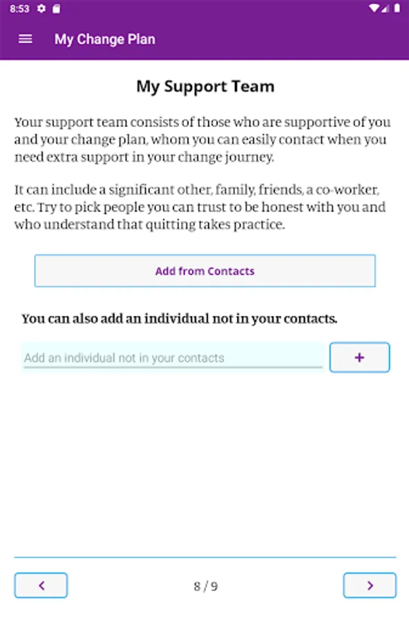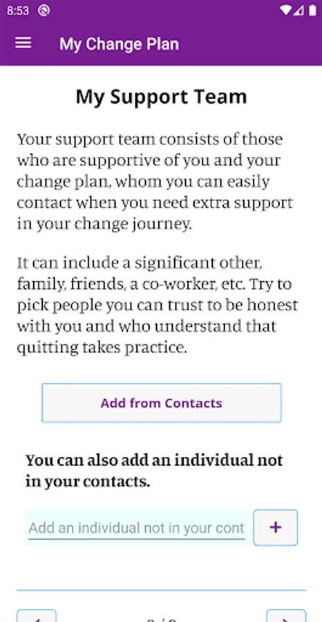 In the app you can create a personalized change plan, including your triggers, coping mechanisms, and your motivations for quitting or reducing smoking. You can also identify people who you can reach out to for support, and create a custom support team within the app. With the information you provide, My Change Plan tracks your progress with easy-to-use graphs and statistics. You can choose your end goals, including a quit date or a date to reduce smoking by, so that your Change Plan is in your hands!