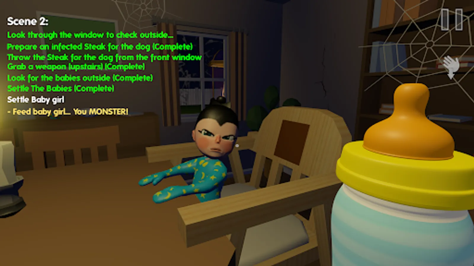 Welcome to Chapter 3: As usual, in the scary baby babysitting horror simulator game: you will not have usual normal mission where you only have to feed the babies… In this scary baby horror game, you will understand more why the baby may seem to have different modes, you are operating just like daddy baby in game like little nightmare scary story for you. In this chapter, you will discover many new secrets about the Scary Baby Kids! The chapter comes up with complete new features and mechanics. It takes place during the Halloween period.
