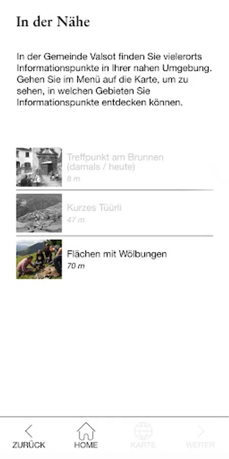 * Open the app when you are in the municipality of Valsot. The «NEARBY» function shows you the information points in your area. Distance information and a map help to find the exact locations