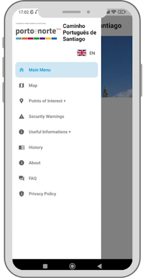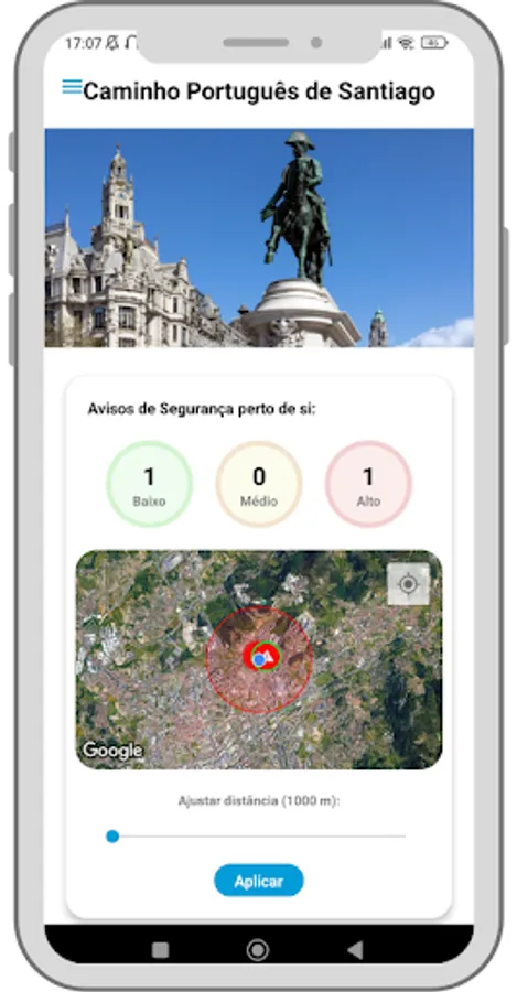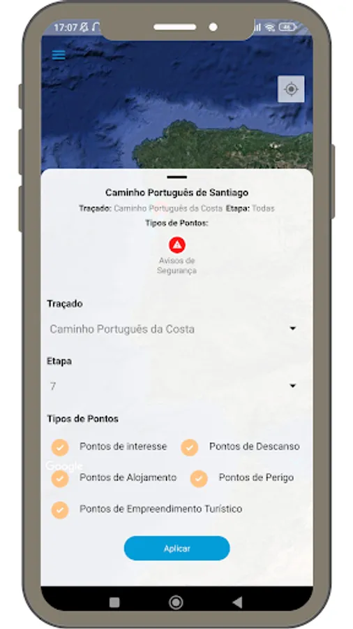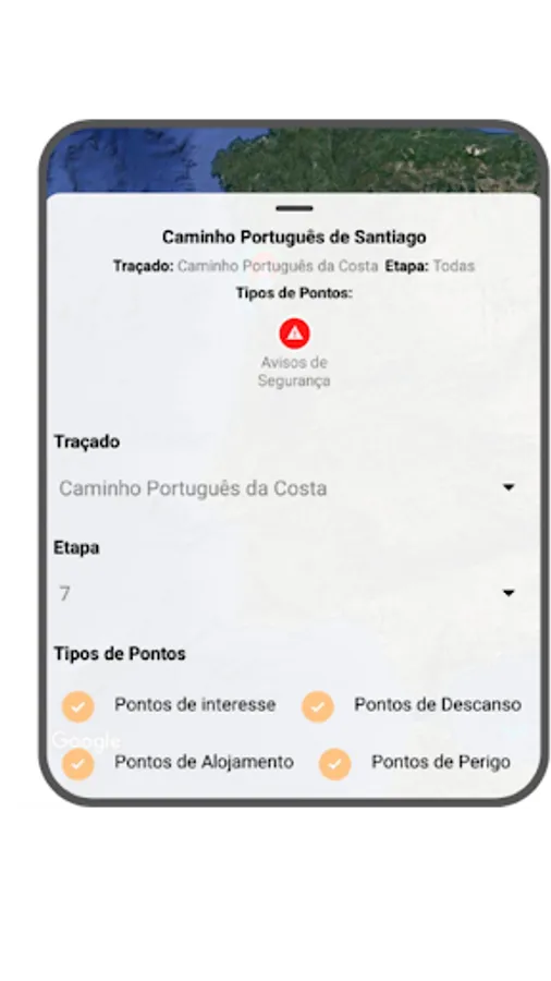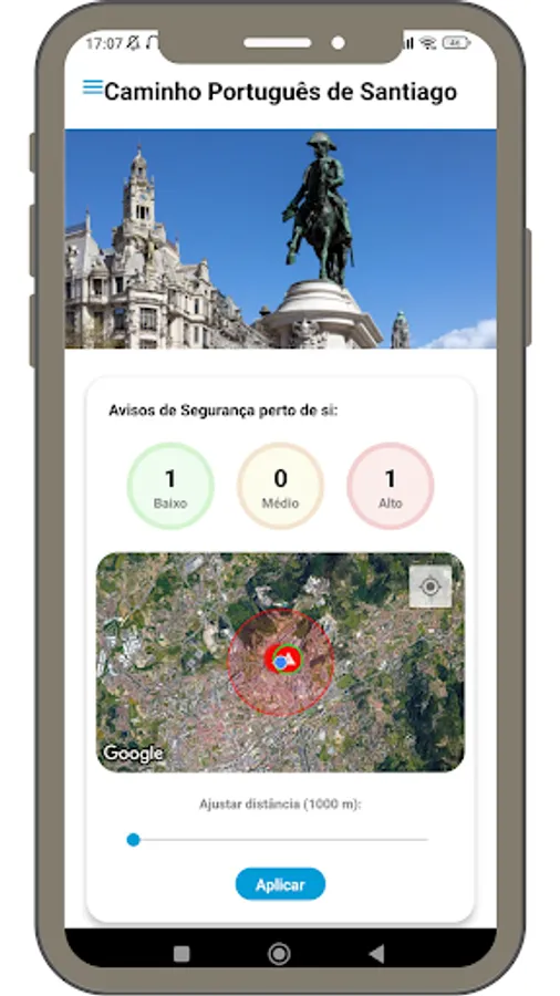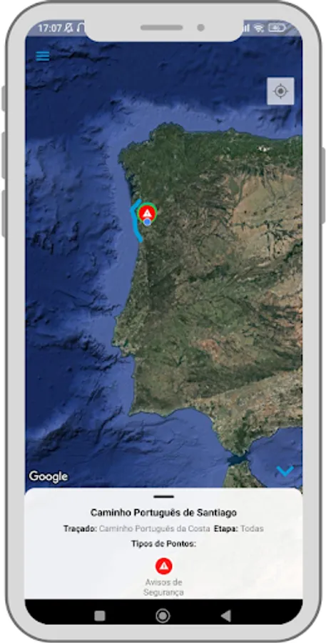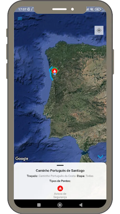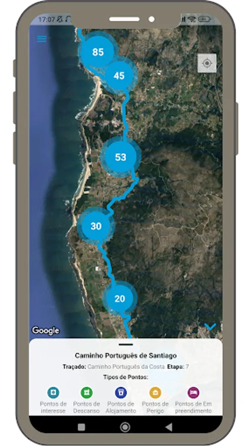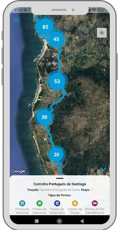 The application provides information about the routes and stages of the Portuguese route, including images, distance, difficulty, route, among others: